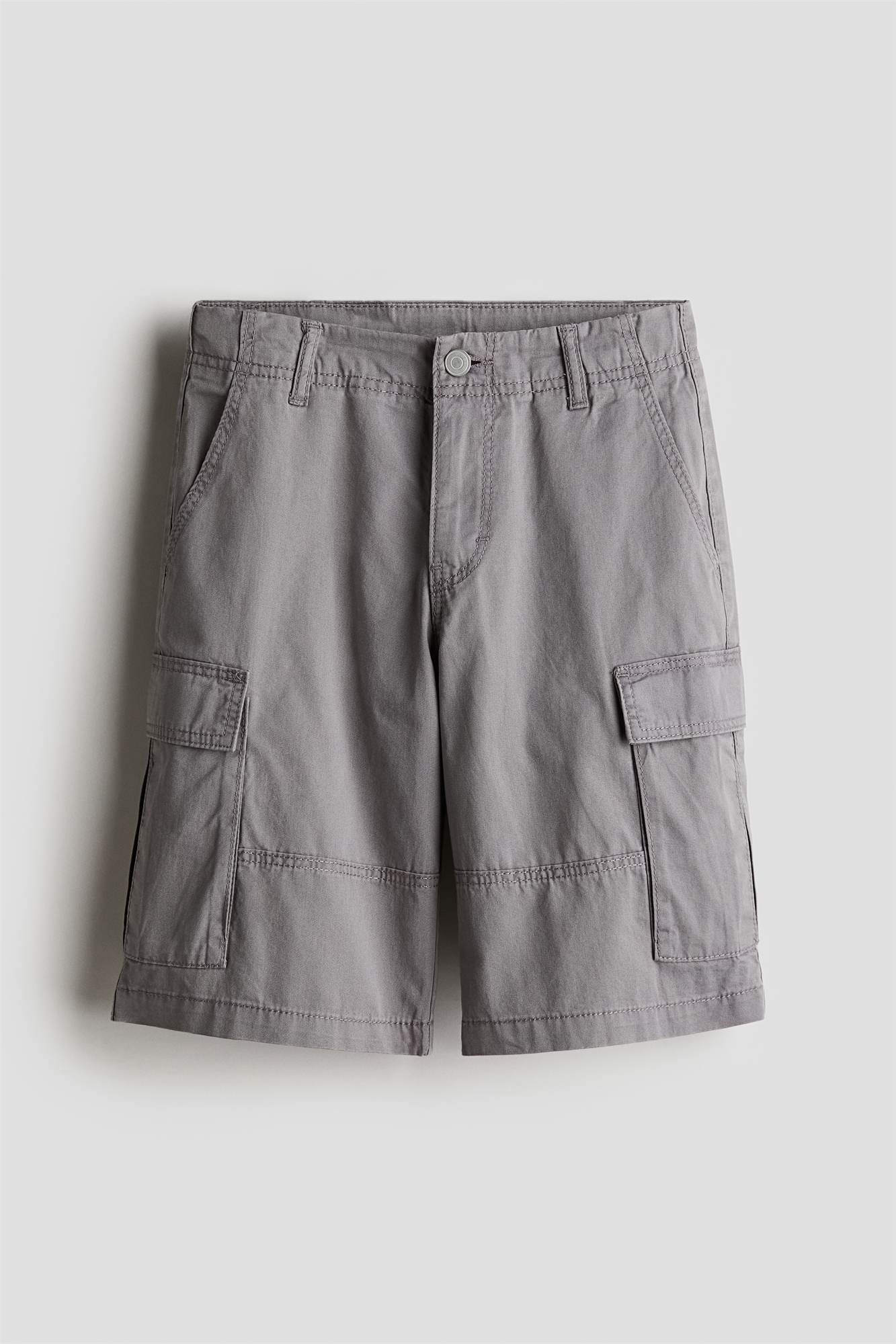 Шорты-карго длиной до колена из хлопковой саржи. Свободный крой с регулируемой резинкой на талии, ширинка на молнии и пуговице, диагональные боковые карманы, задние карманы и накладные карманы на ногах с клапаном.