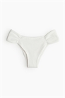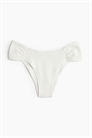 Трусики-бикини на подкладке, со средней талией, широким ремешком со сборками по бокам и вырезом сзади.