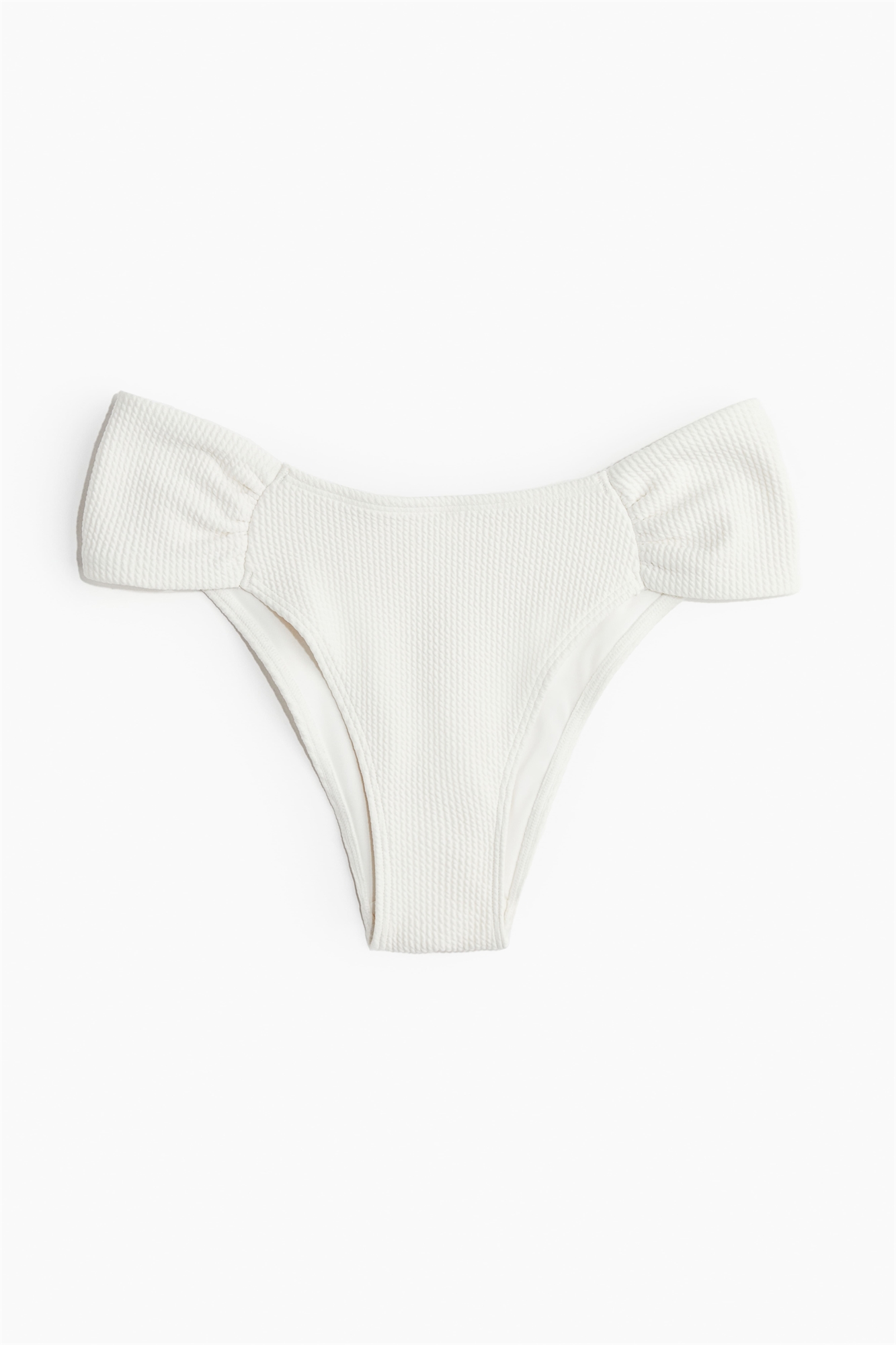 Трусики-бикини на подкладке, со средней талией, широким ремешком со сборками по бокам и вырезом сзади.
