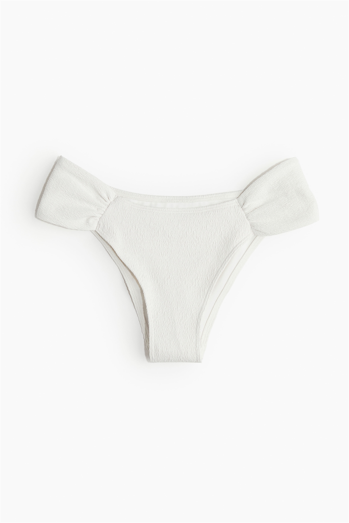 Трусики-бикини на подкладке, со средней талией, широким ремешком со сборками по бокам и вырезом сзади.