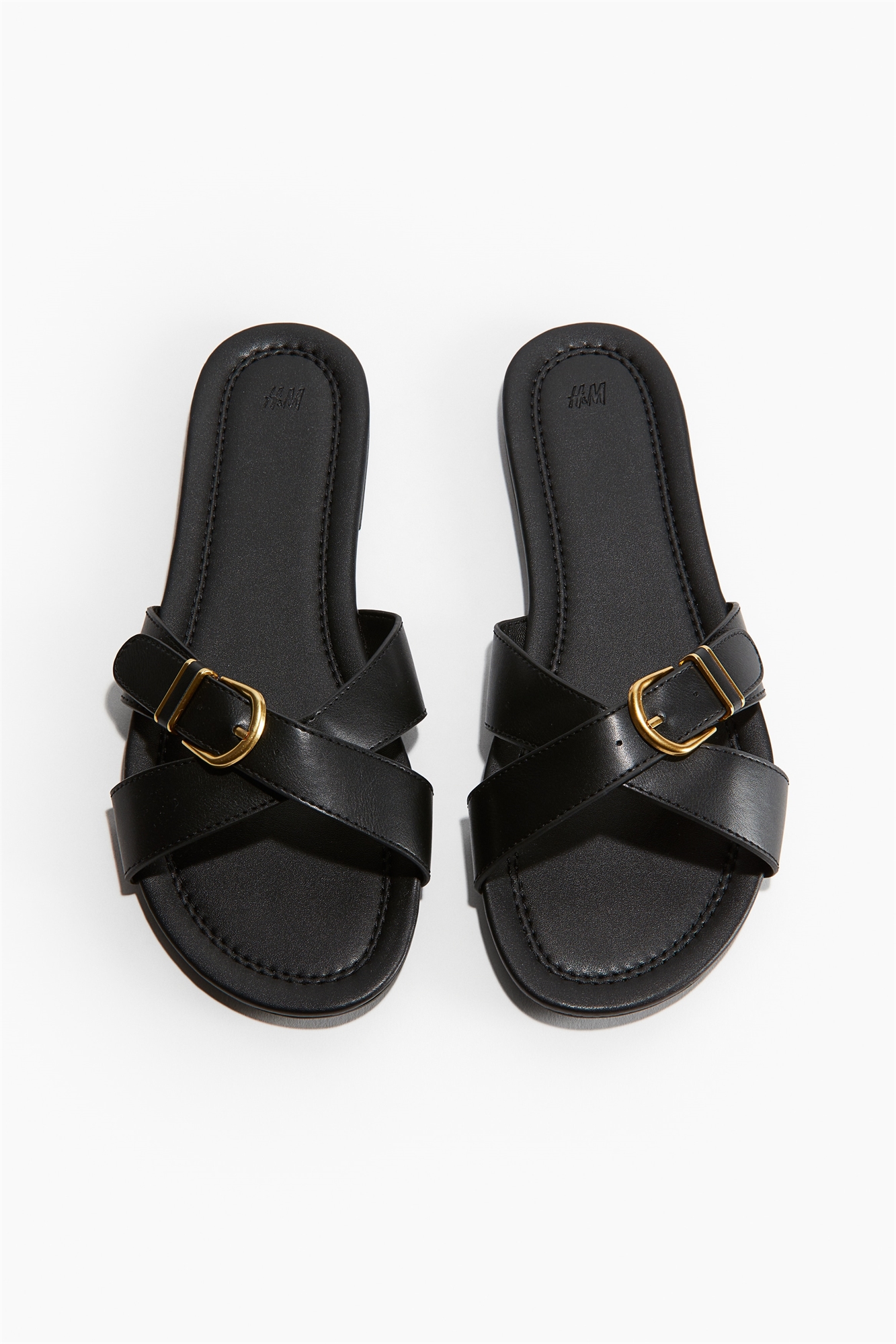 Сандалии с миндалевидными носками и перекрещивающимися ремешками с металлической пряжкой.