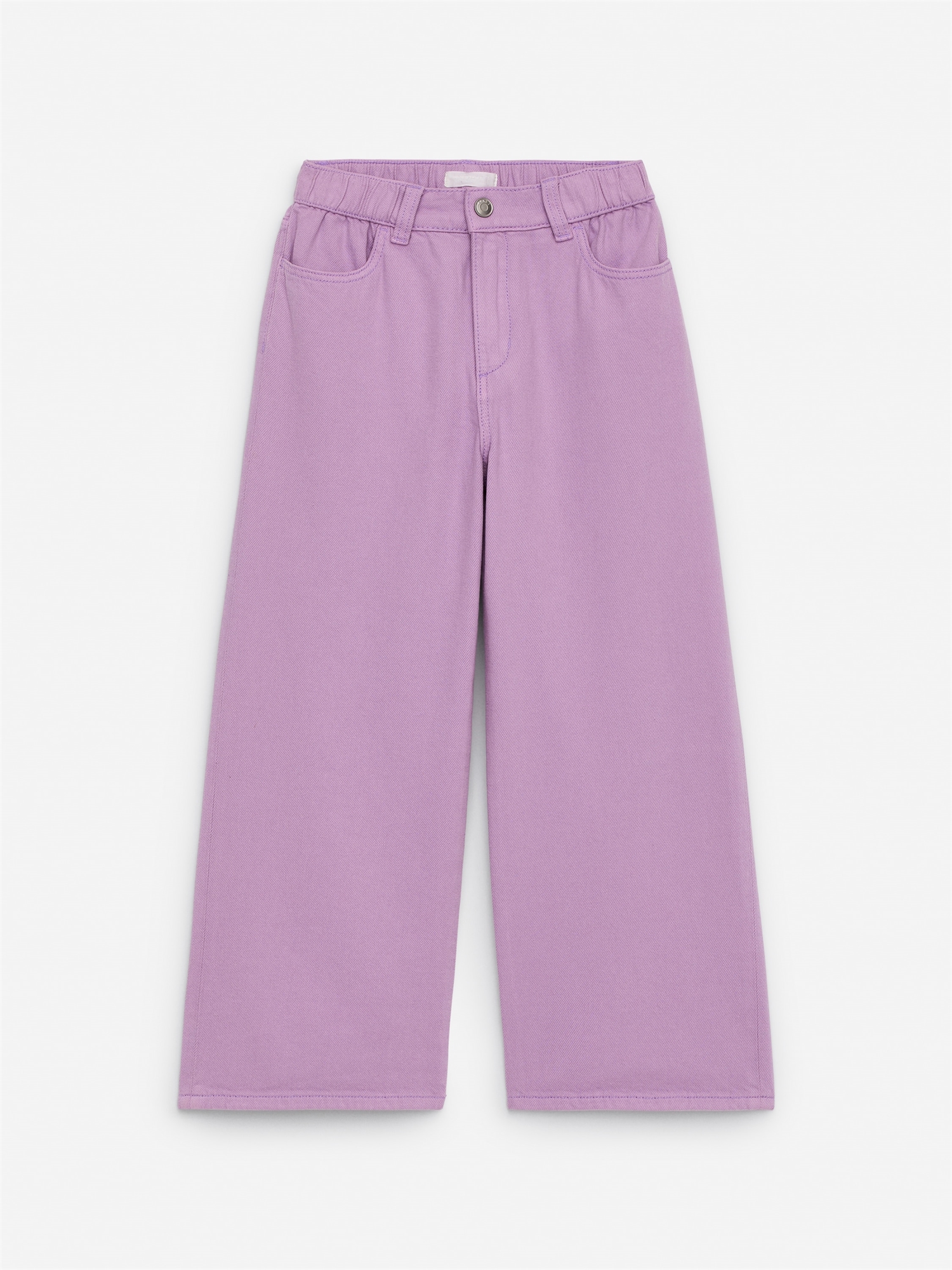 Широкие джинсы из стираной хлопковой ткани. Регулируемая резинка на талии. Карманы спереди и сзади и петли для ремня.
