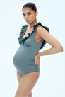 Полностью закрытый купальник с глубоким V-образным вырезом с оборкой, переходящей на плечи. Чашечки со съемными вставками, придающими форму бюсту и обеспечивающими хорошую поддержку. Сборки под бюстом и по бокам для лучшей посадки на животе. Средняя посадка сзади.