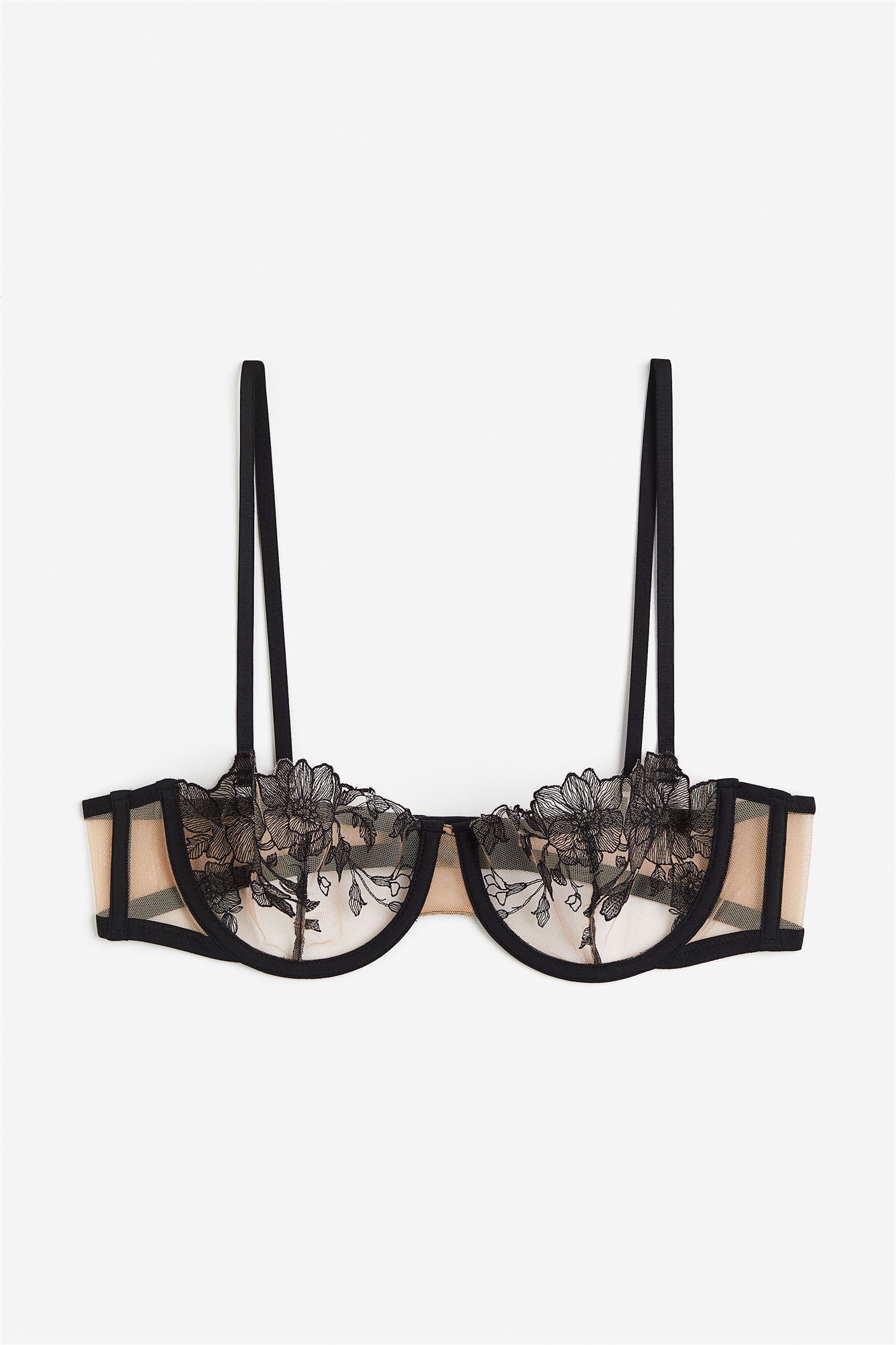 Бюстгальтер-балконет из прозрачной сетки с нежной вышивкой. Чашечки без подкладки с заниженной талией придают бюсту естественную форму и обеспечивают легкую поддержку. Боковая поддержка, регулируемые бретели и застежка на крючки и глазки сзади.