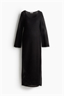 Длинное платье из мягкого дырчатого трикотажа с глубоким круглым вырезом и длинными расклешенными рукавами. Прямой подол с высоким разрезом с одной стороны. Короткое нижнее платье из джерси с узкими бретелями.