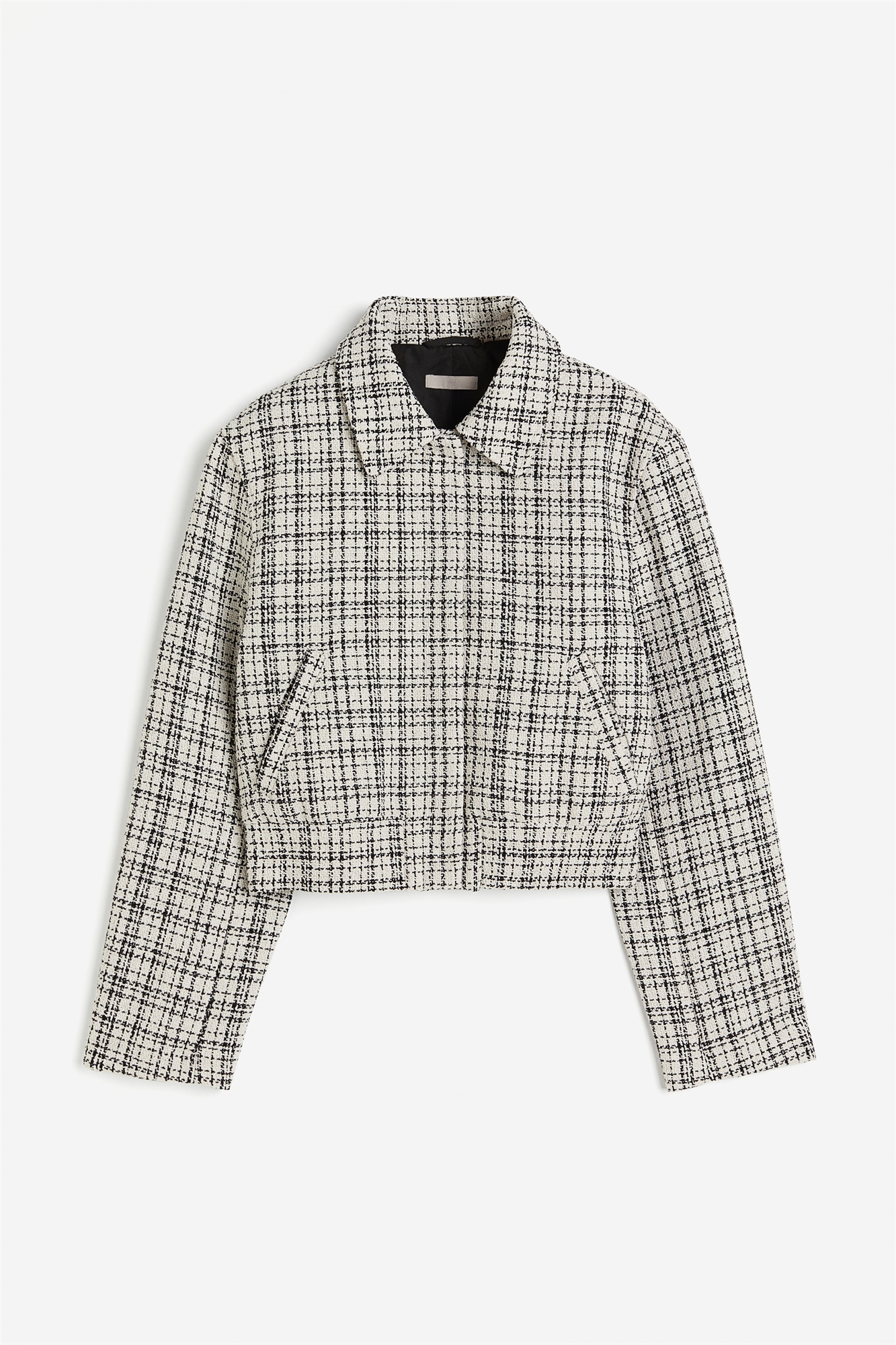 Короткий жакет из ткани букле с воротником и потайными кнопками спереди. Свободный крой, слегка спущенные плечи, длинные рукава, втачные боковые карманы и платочная вставка по подолу. На подкладке.