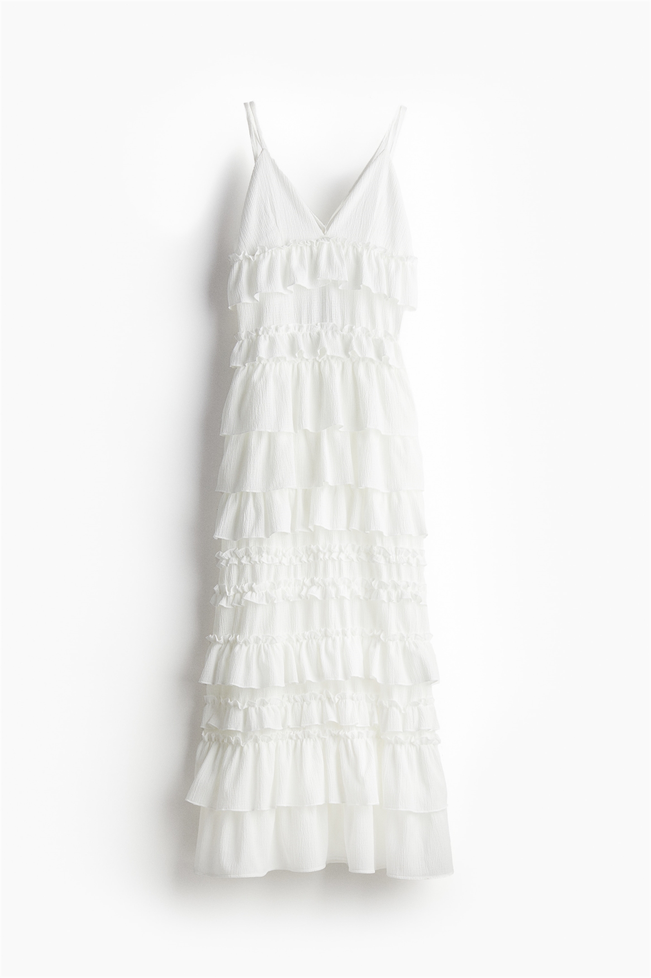 Длинное платье из ворсистой ткани с V-образным вырезом, формованными чашечками и низким вырезом на спине. Узкая эластичная лента в верхней части. Узкие регулируемые двойные бретели, одна из которых начинается в центре спереди и перекрещивается сзади. Ярусы воланов разной ширины с оверлочным краем. На подкладке в области бюста.