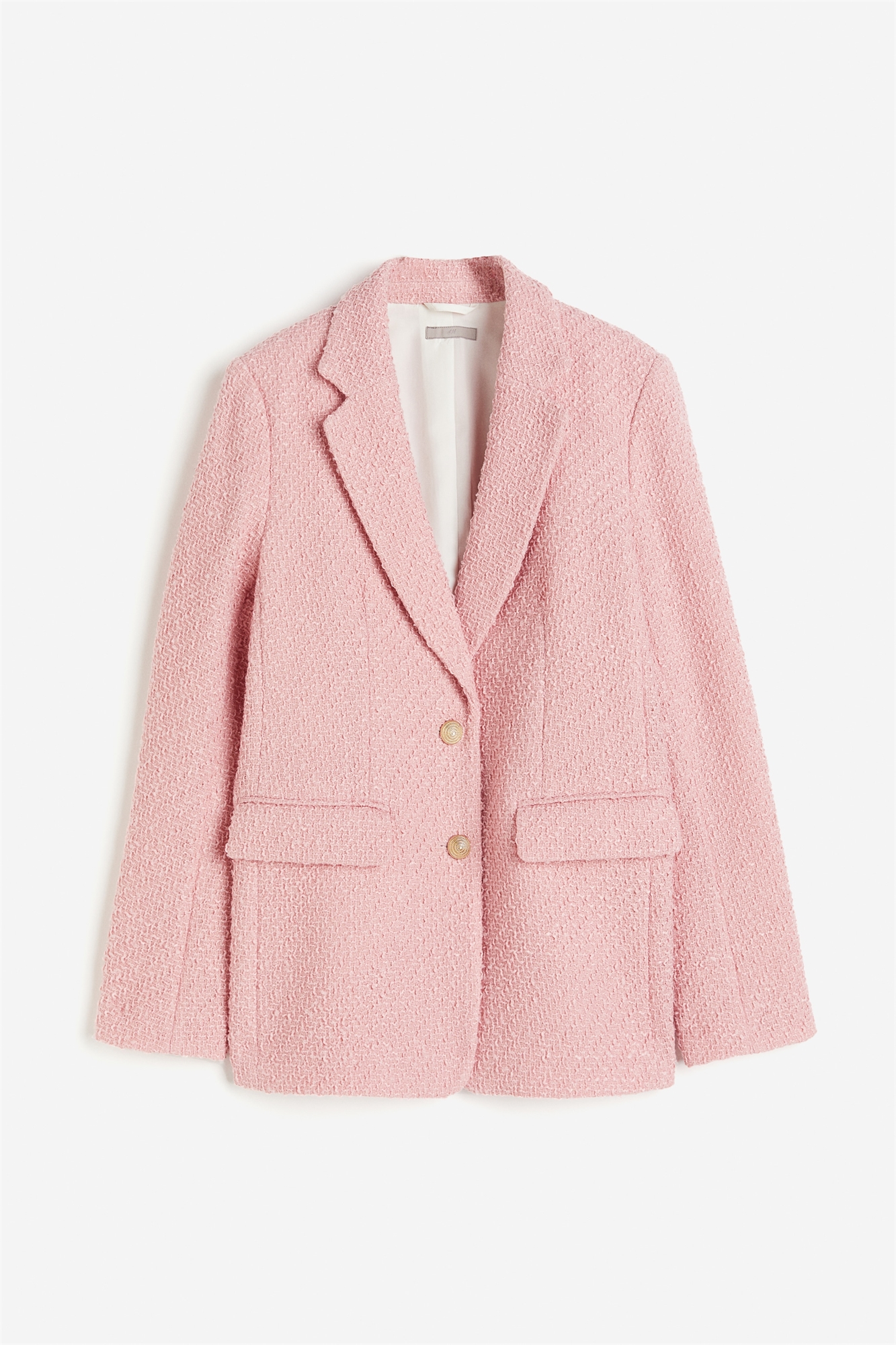 Слегка удлиненный однобортный блейзер из букле с отложным воротником, подплечниками, пуговицами на рукавах и накладными карманами. Потайной разрез сзади. На подкладке.