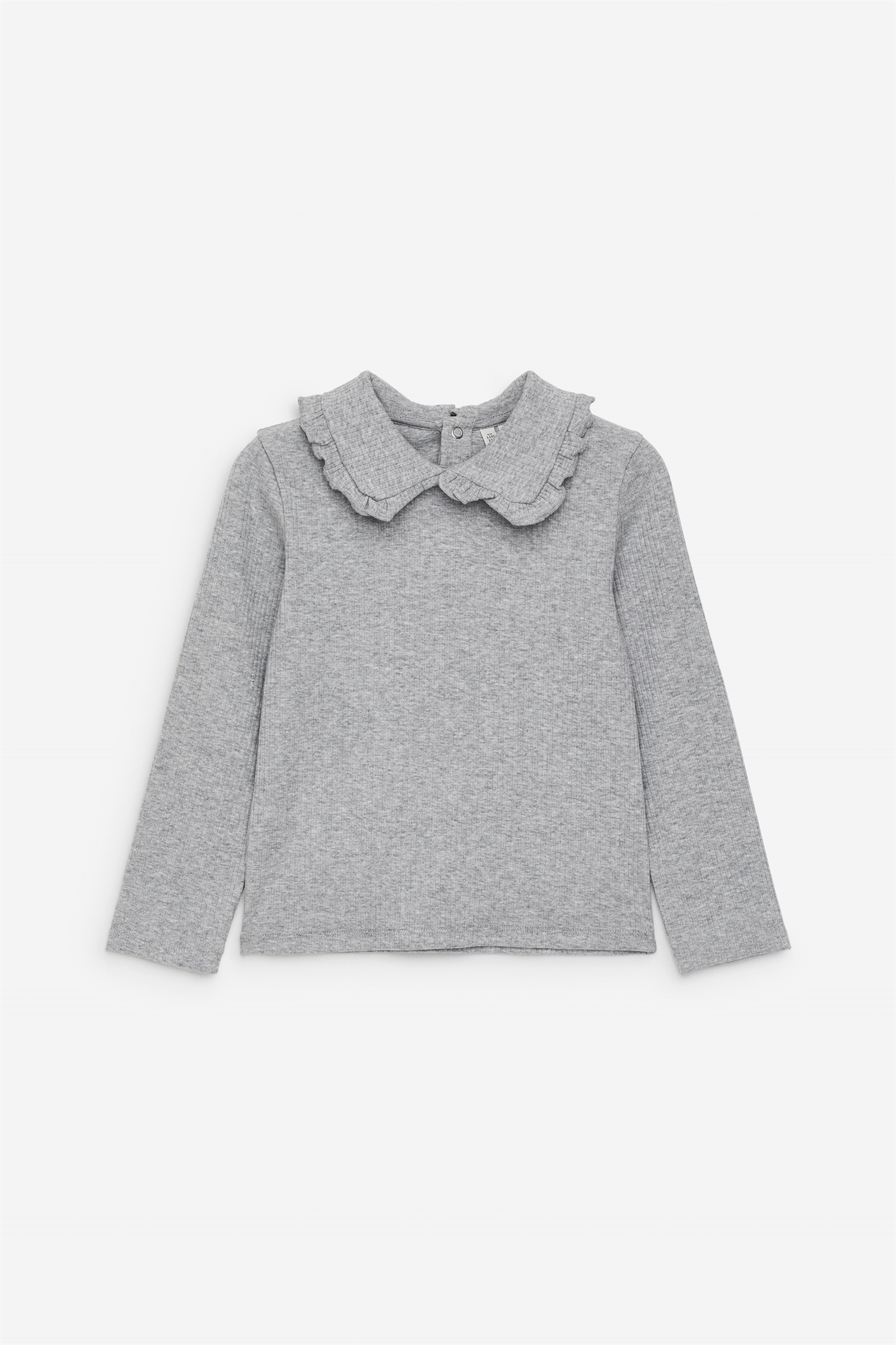 Топ с длинными рукавами из хлопкового трикотажа пуантель. Воротник с оборками, края в виде вавилонов и застежка на пуговицах по центру спины.