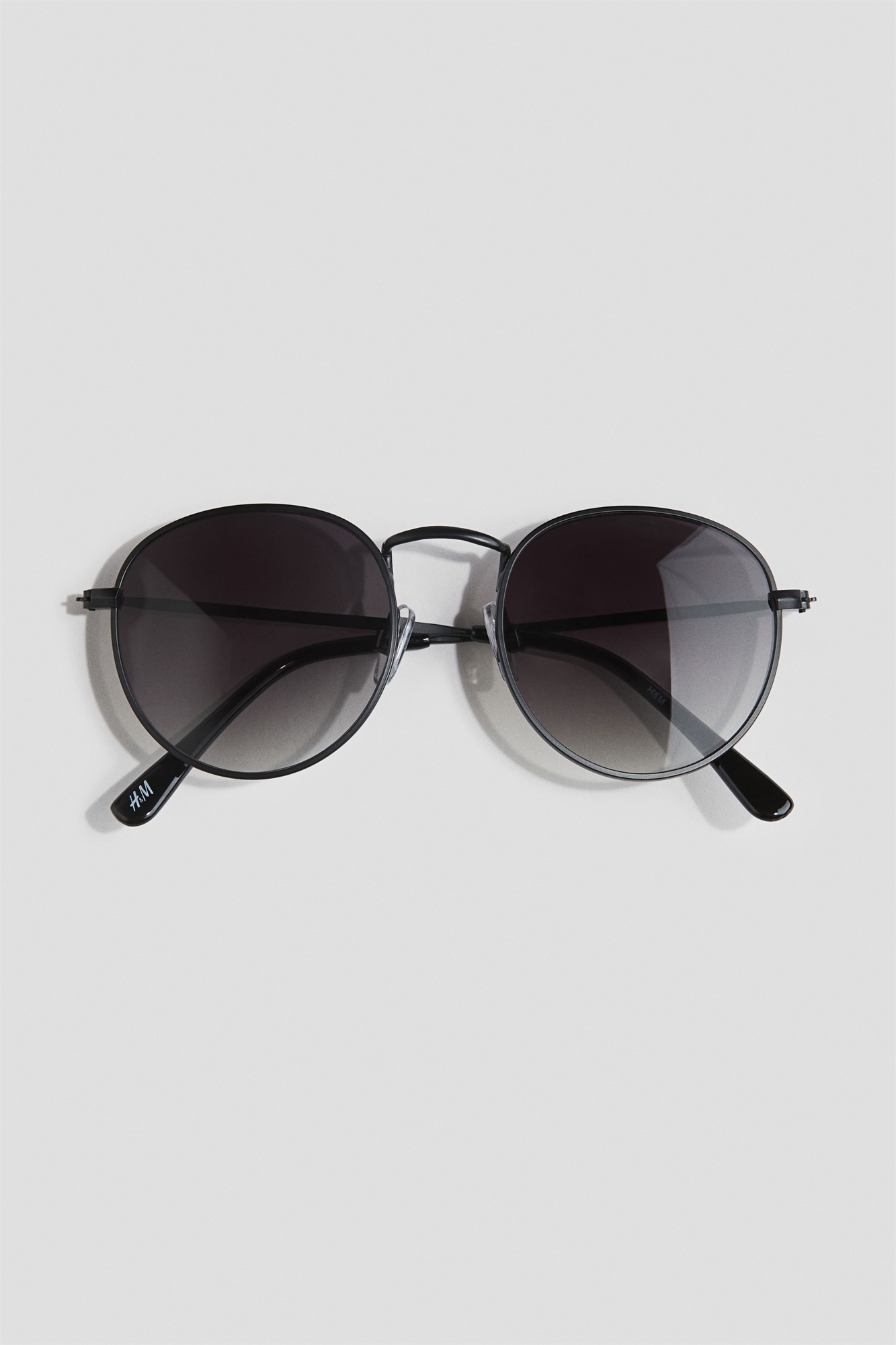 Круглые солнцезащитные очки с тонкой металлической оправой и боковыми дужками из металла и пластика. Тонированные линзы с УФ-защитой.