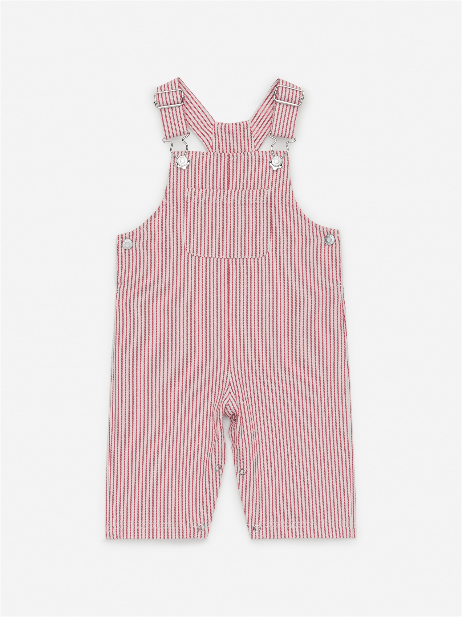 Дунгары с полосатым узором "гикори" из мягкого хлопкового полотна. Модель имеет нагрудный карман спереди и один задний карман. Застежка на пуговицы в промежности для всех размеров, кроме 86-92. Обычный крой.