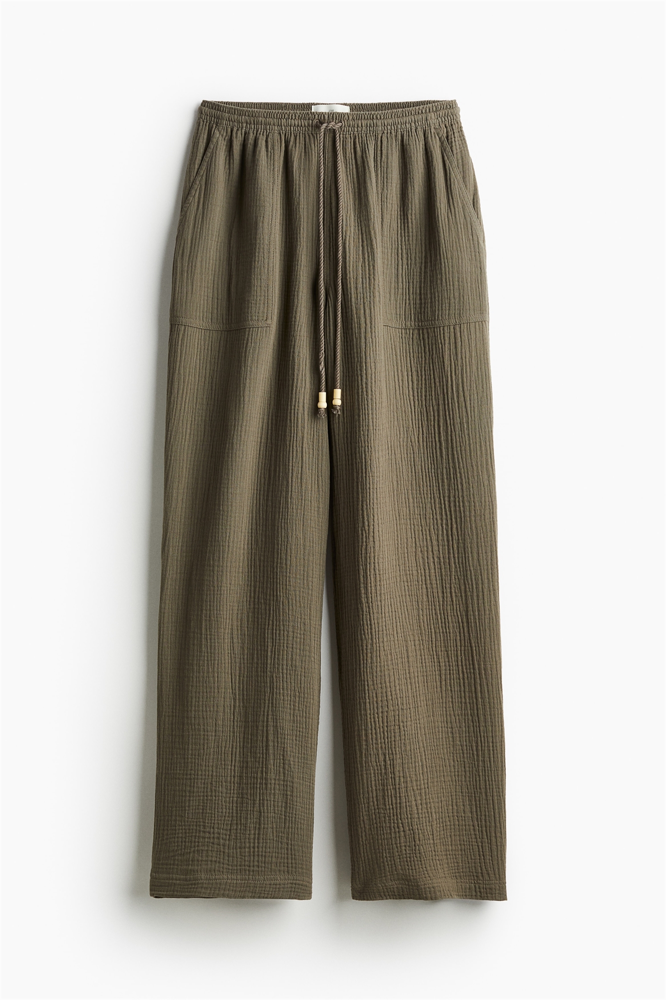 Свободные брюки из мягкого хлопкового муслина с эластичной резинкой на талии и крученым шнурком с бусинами на концах. Накладные боковые карманы и слегка расклешенные ноги.