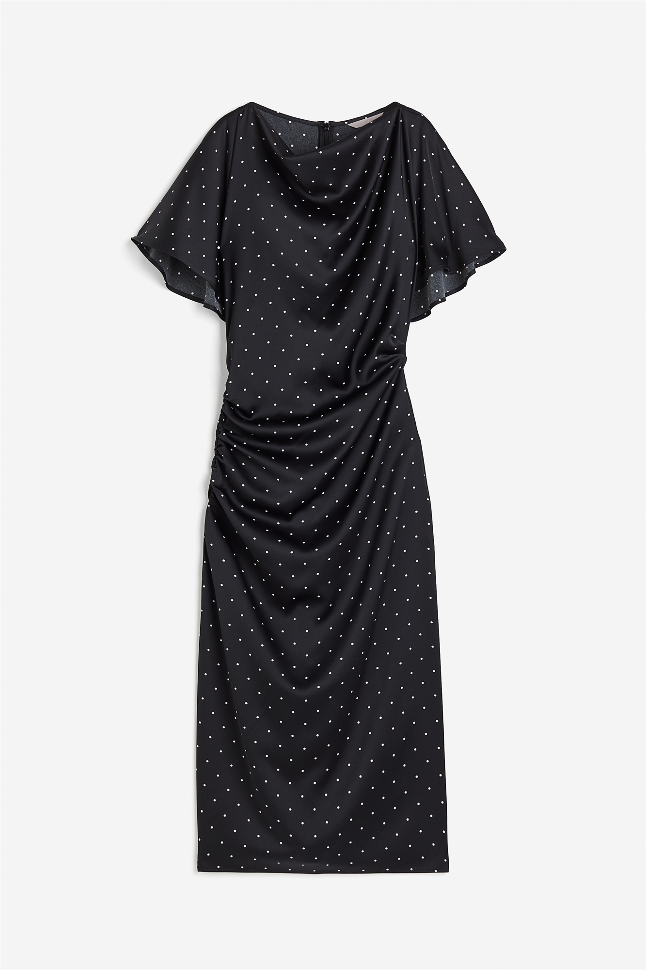 Платье длиной до колена из крепового атласа с вырезом-лодочкой и короткими рукавами-бабочками. Присборенный шов на талии с одной стороны для придания силуэту мягкой драпировки и прямой подол с разрезом с одной стороны. Потайная застежка-молния сзади. Без подкладки.