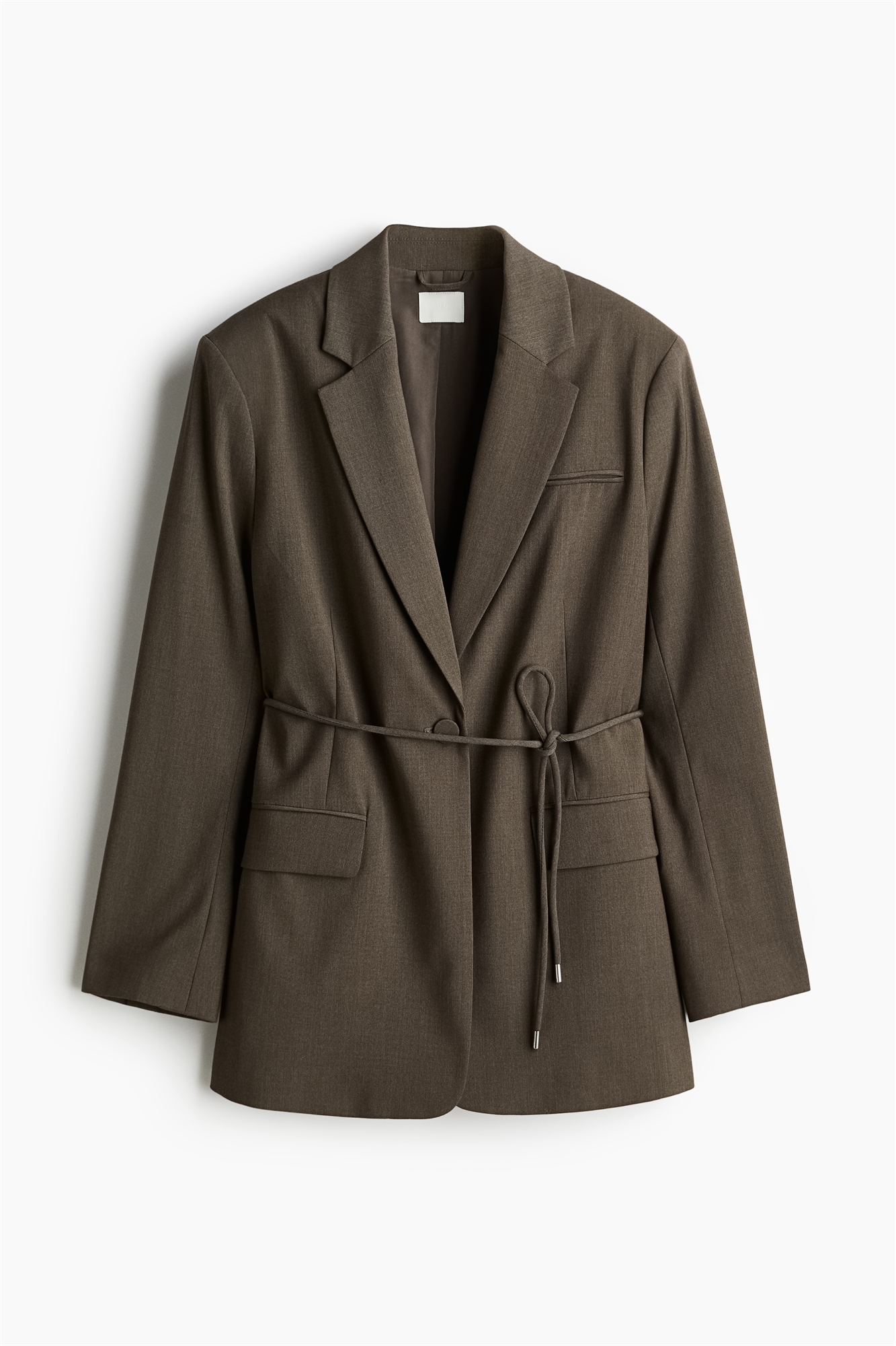 Слегка удлиненный приталенный блейзер из тканого материала с лацканами с вырезом и застежкой на пуговицу спереди. Накладки на плечах, нагрудный карман и втачные передние карманы с клапаном. Прорези на манжетах и узкий съемный пояс на талии. На подкладке.