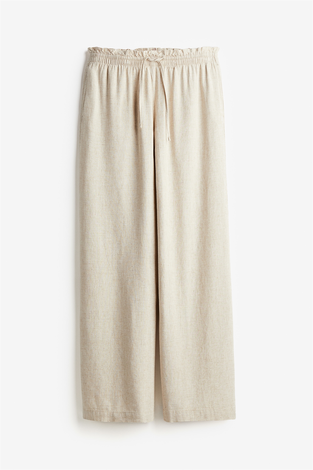 Свободные брюки с воздушным плетением из смеси льна и вискозы. Регулярная талия с эластичным поясом, утягивающим шнурком и небольшой оборкой. Небрежные боковые карманы и широкие штанины.