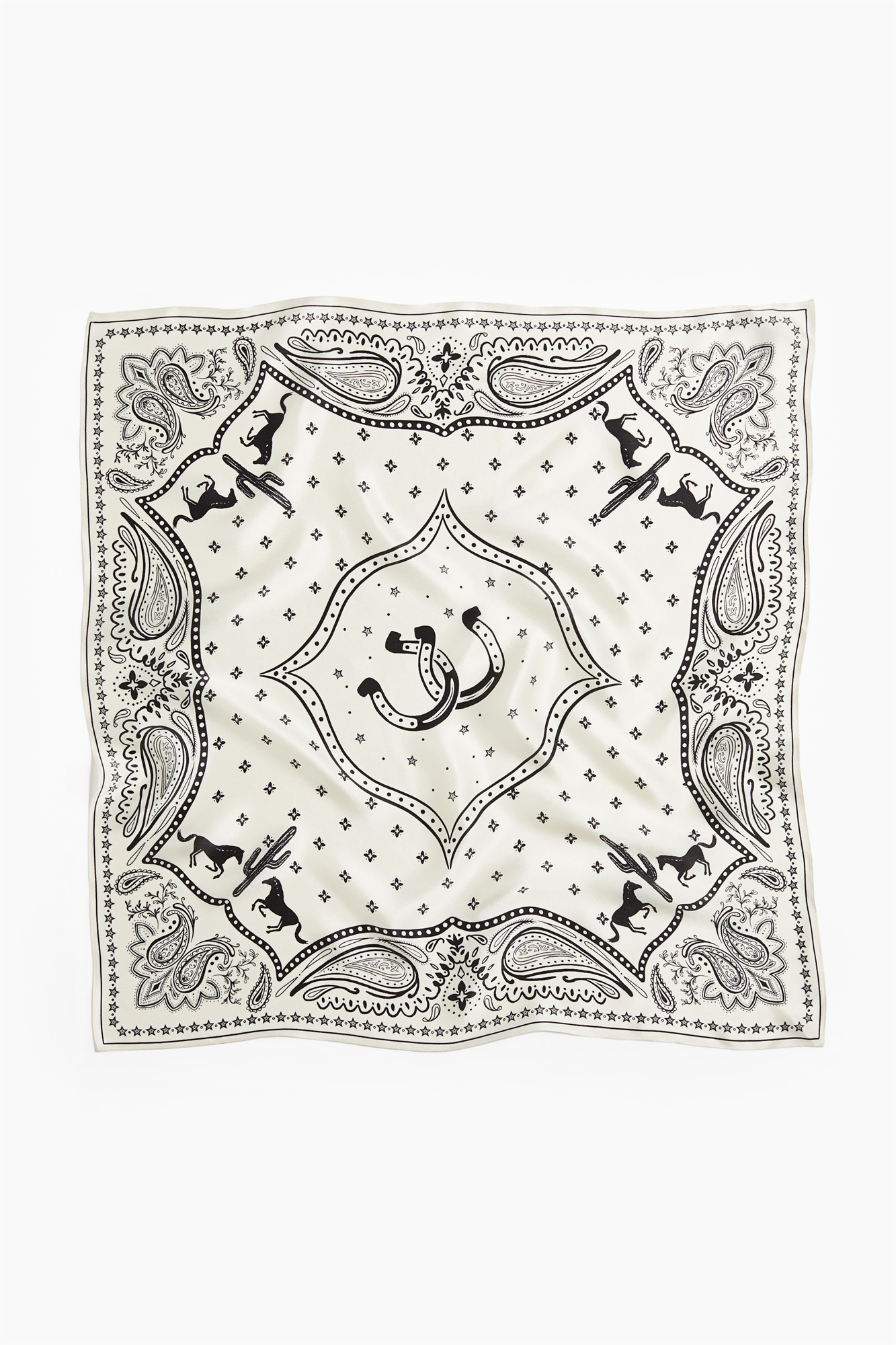 Квадратный шарф из мягкого шелка тутового цвета с набивным рисунком.