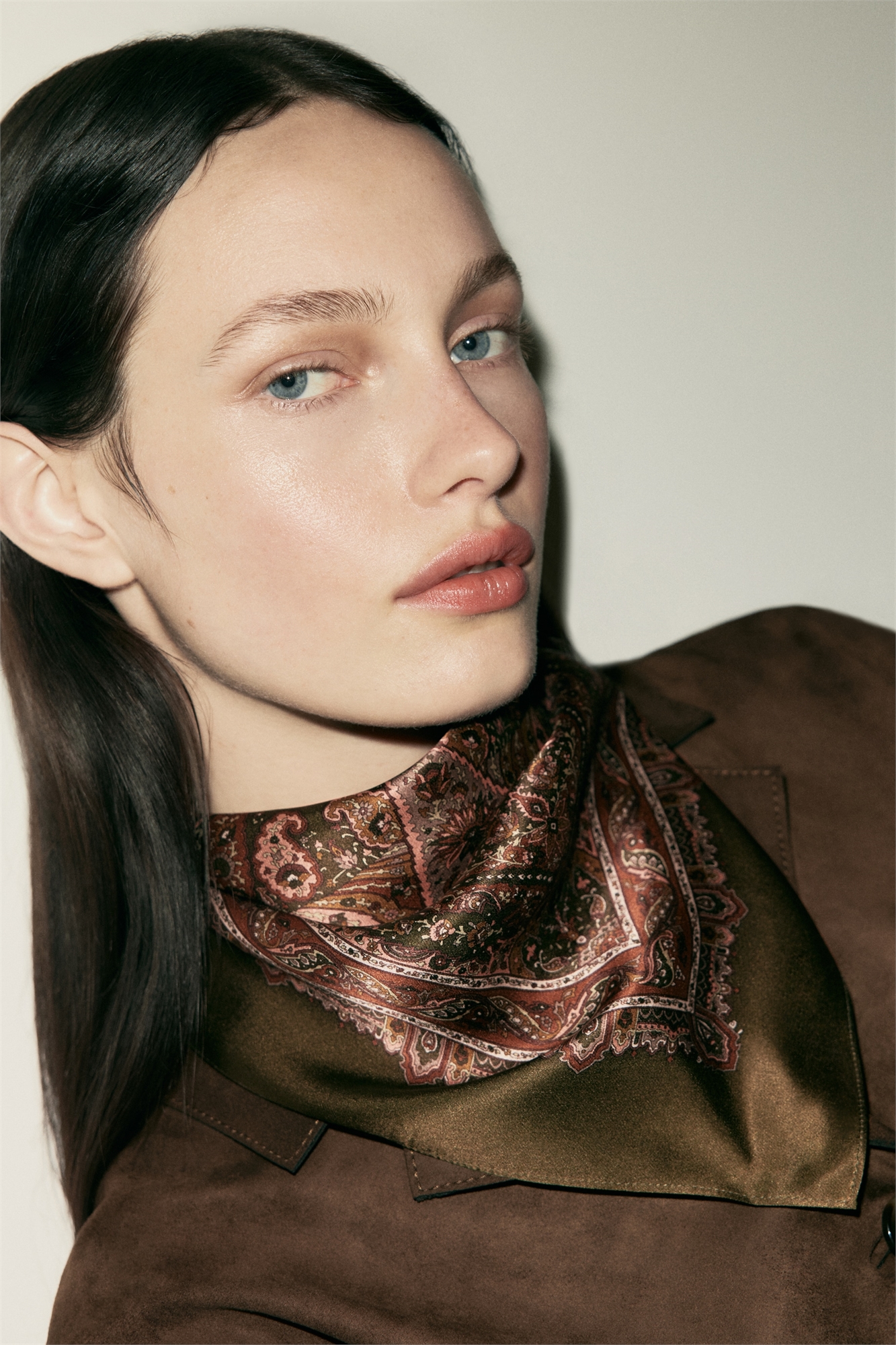 Квадратный шарф из мягкого шелка тутового цвета с набивным рисунком.