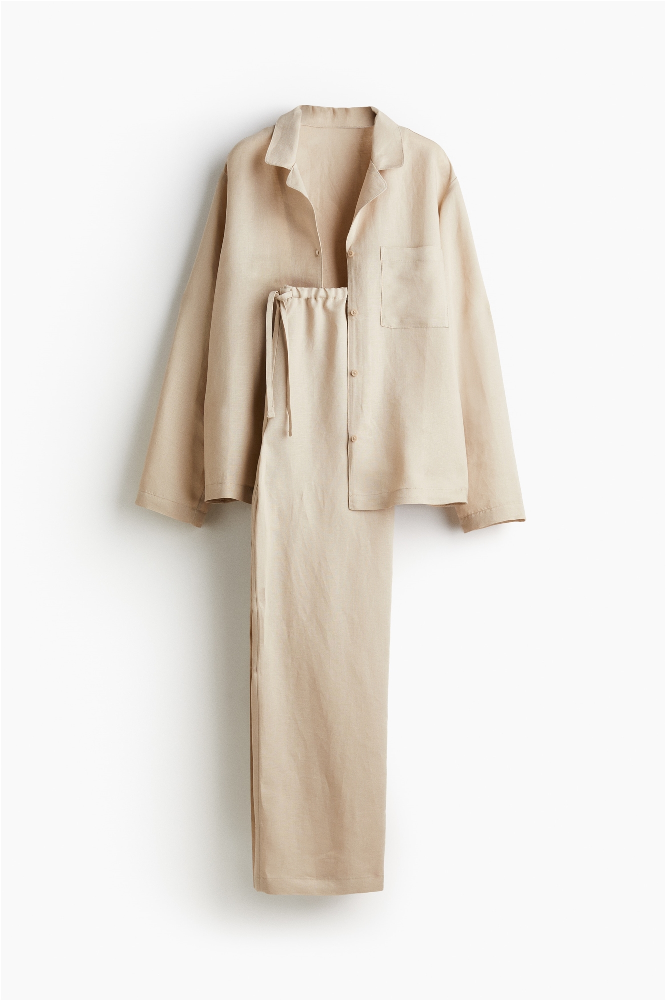 Пижама с рубашкой и нижней частью из смеси льна и вискозы с воздушным плетением. Рубашка с длинными рукавами, отложным воротником, пуговицами спереди и открытым нагрудным карманом. Нижние штанишки с эластичным утягивающим поясом и широкими ножками.
