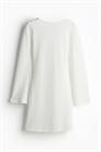 Короткое приталенное платье из мягкого трикотажа с круглым вырезом и частично открытой спиной с узкими завязками с бисером на концах. Длинные рукава и прямой подол.