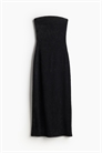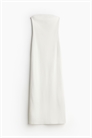 Приталенное платье-бандо длиной до колен из ребристого хлопкового джерси со скрытой силиконовой отделкой в верхней части, чтобы оно держалось на месте. Подол прямого кроя с разрезом сзади. На подкладке в области бюста.