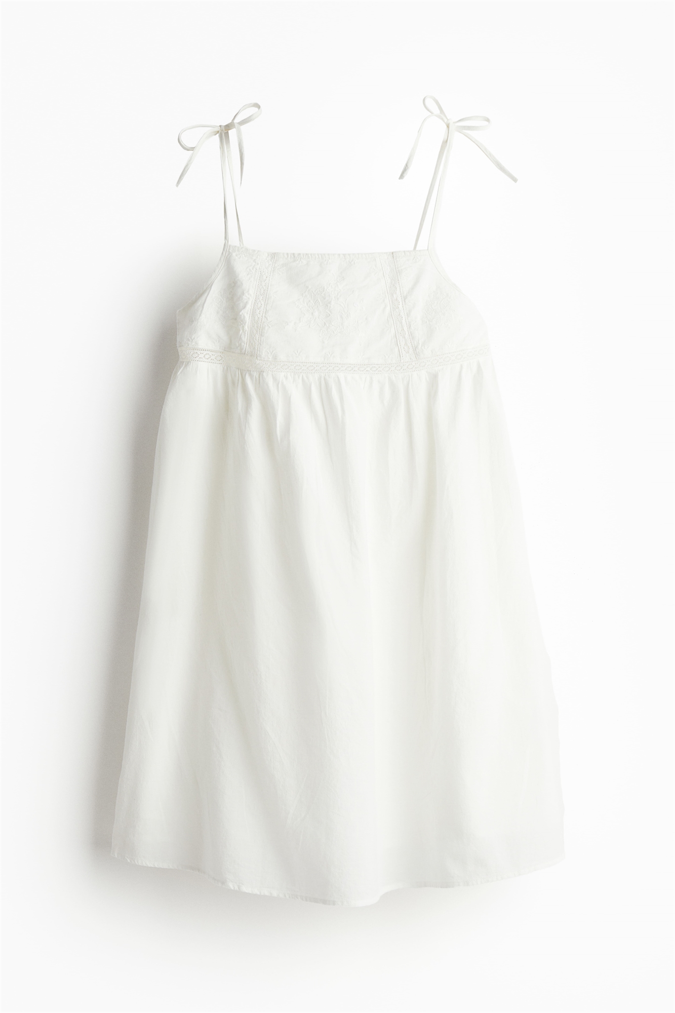 Короткое платье А-линии из мягкого хлопкового полотна с нежной вышивкой и кружевными вставками на бюсте. Квадратный вырез с узкой эластичной резинкой сзади, узкие бретели с завязками и прямой подол. На подкладке.