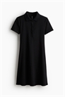 Короткое платье из ребристого джерси с воротником, застежкой на пуговицы и короткими рукавами. Облегающий лиф и слегка расклешенная юбка.