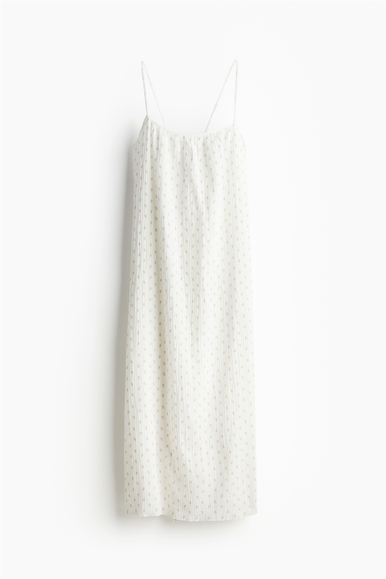 Платье длиной до колен из хлопчатобумажной ткани с квадратным вырезом и низким разрезом на спине с завязками. Узкие бретели продеваются через небольшие петли и завязываются сзади. Без подкладки.