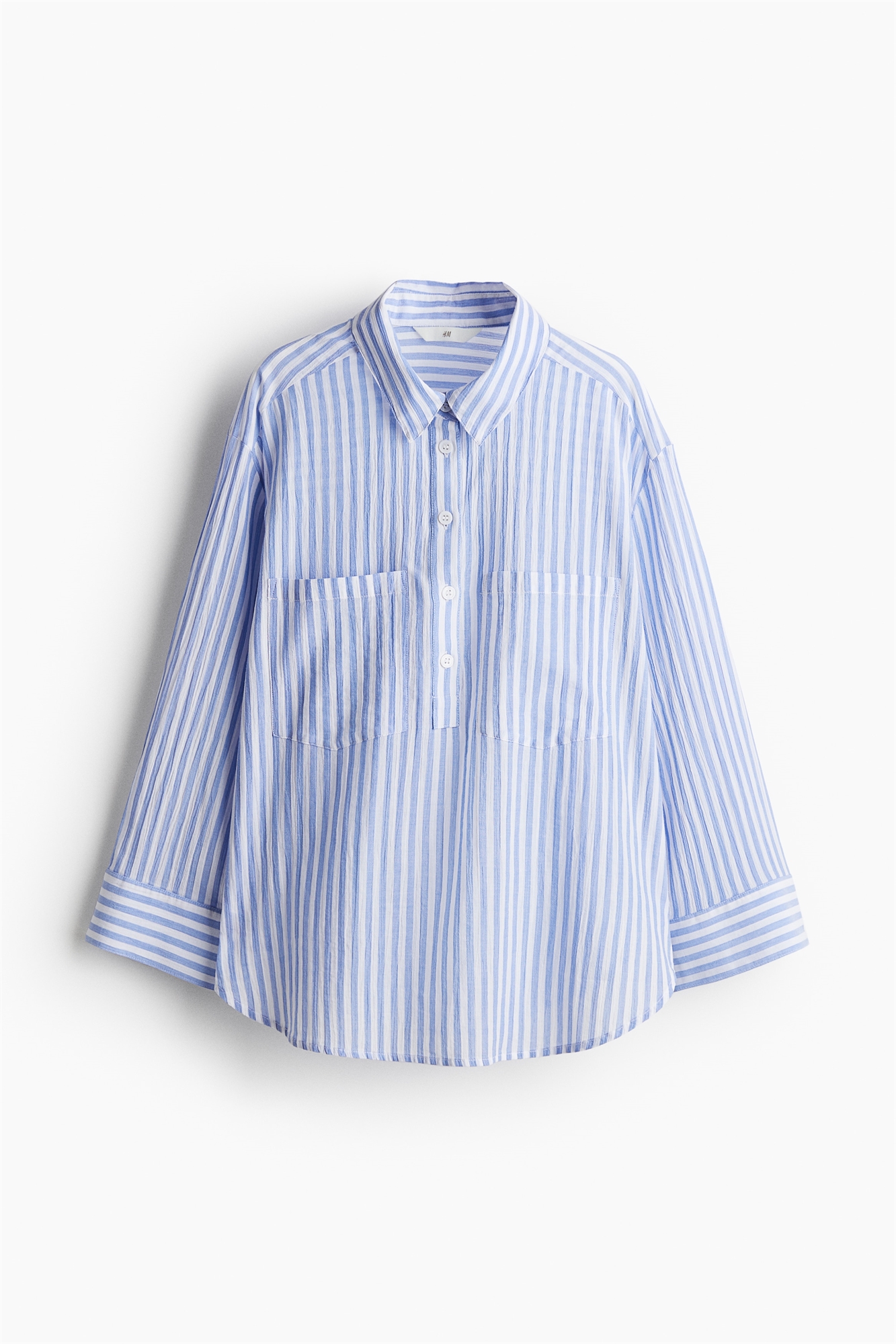 Свободная рубашка из мягкого хлопкового муслина с воротником и застежкой на пуговицы спереди. Накладные нагрудные карманы, ярмо со складками сзади и рукава с манжетами длиной 3/4. Аккуратный закругленный подол.