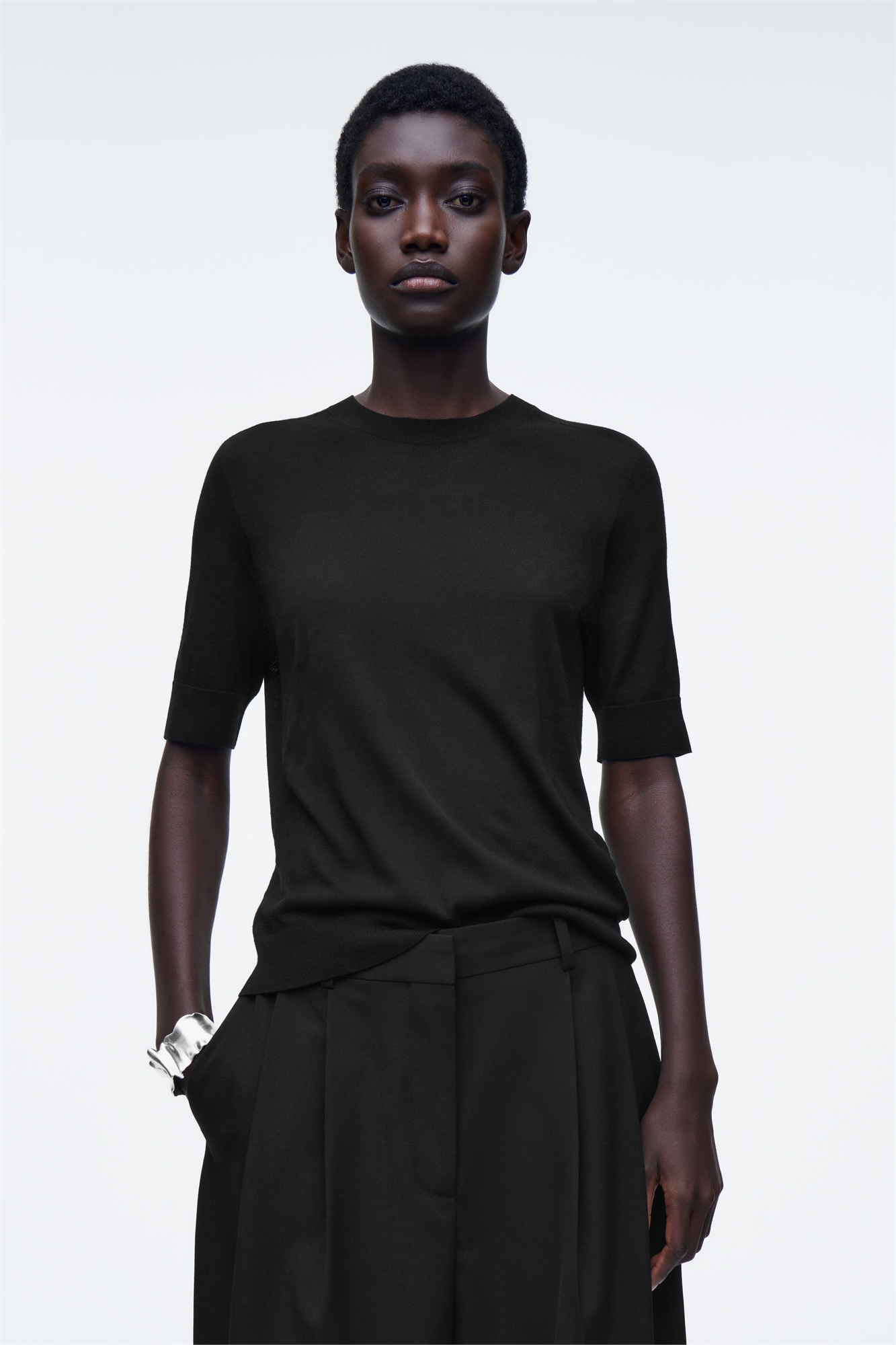 Изысканные вещи - краеугольный камень каждой коллекции готовой одежды COS. Эта футболка мастерски связана из супертонкой мериносовой шерсти премиум-класса, которая отличается мягкостью и естественной терморегуляцией. Она имеет зауженный крой, который подходит для многослойной носки. Облегающий крой Этот продукт сертифицирован Responsible Wool Standard (RWS) Control Union 893290 и содержит шерстяное волокно с ферм, сертифицированных на соответствие требованиям по благополучию животных и землепользованию Шелл: 100% мериносовая шерсть. Без учета отделки / Машинная стирка Длина по спинке размера S составляет 60 см / Модель носит размер S