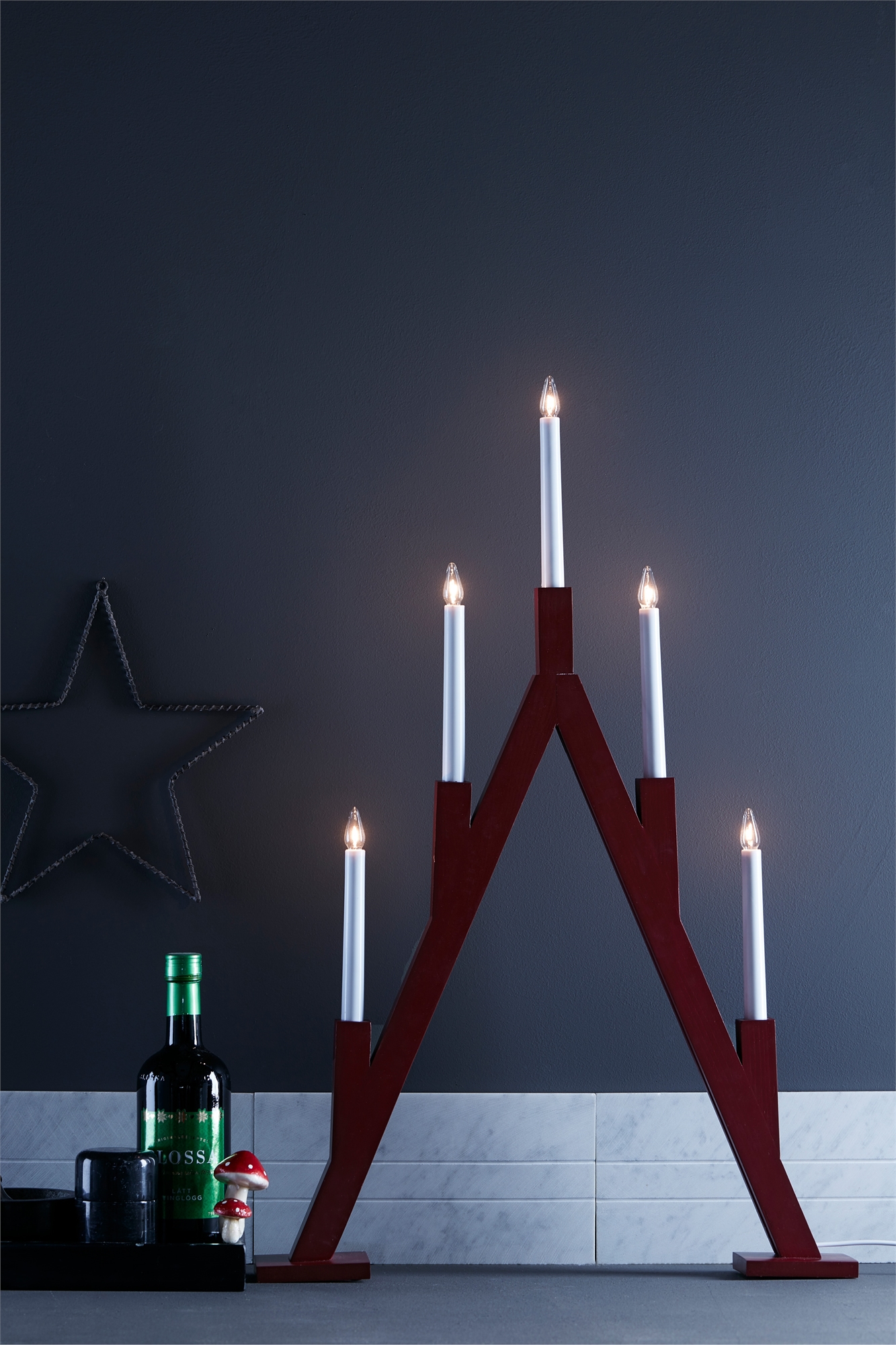 Высокий красный подсвечник с 5 свечами добавит рождественского настроения в вашу комнату. Подсвечник Advent сочетает в себе прямые формы и классический дизайн. Для подсвечника требуется пять лампочек с маленьким цоколем (E10) мощностью не более 3 Вт, входят в комплект. Белый кабель длиной 2 м с выключателем. Размер лампочки: ширина 56 см, глубина 6,5 см, высота 77 см.