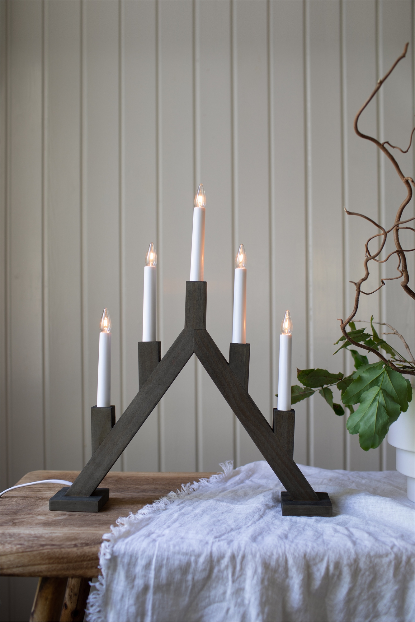 Деревянный подсвечник с 5 свечами для придания комнате рождественского настроения. Подсвечник Advent сочетает в себе прямые формы и классический дизайн. Для подсвечника предусмотрено пять лампочек с маленьким цоколем (E10) мощностью не более 3 Вт. Белый кабель длиной 2 м с выключателем. Размер лампочки: 40 см в ширину, 7 см в глубину, 47,5 см в высоту.