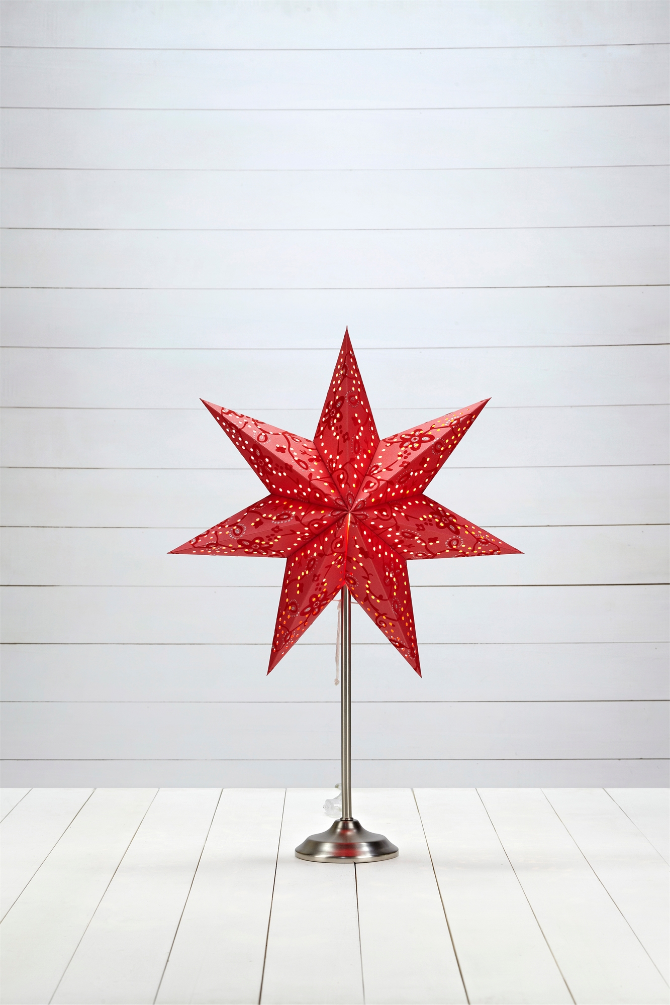 Настольная звезда, улучшающая настроение, с красным бумажным принтом и металлическим основанием. Для звезды требуется лампочка с маленьким цоколем (E14) мощностью не более 25 Вт или эквивалентная светодиодная, в комплект не входит. Прозрачный кабель длиной 2 м с выключателем. Размер лампы: 45 см в ширину, 21 см в глубину, 64 см в высоту.