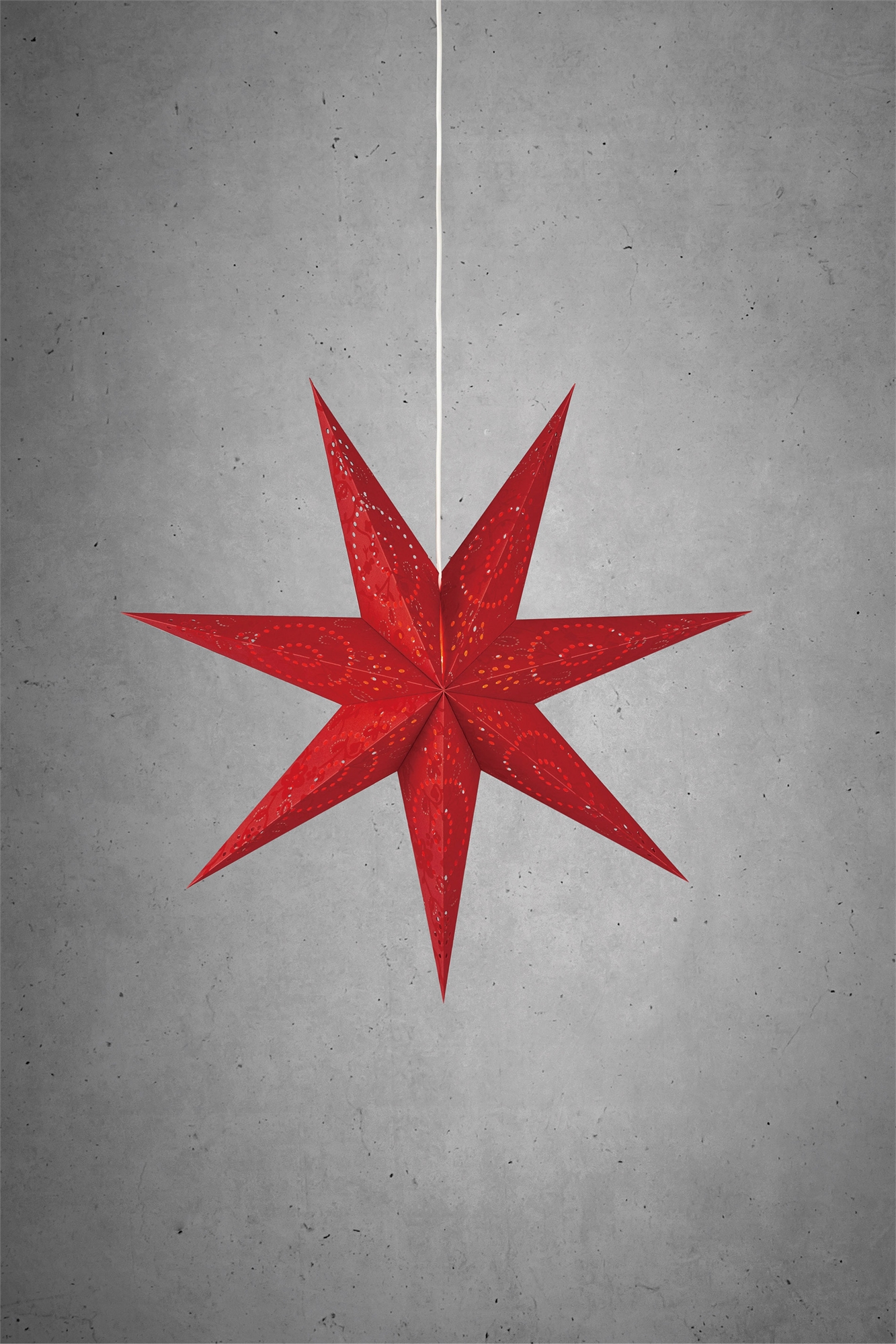 Большая красная пуансеттия диаметром 75 см. Рождественская звезда сделана из бумаги с отверстиями, которые прекрасно пропускают свет. Для звезды требуется лампочка с маленьким цоколем (E14) мощностью не более 25 Вт или эквивалентная светодиодная, в комплект не входит. Белый кабель длиной 3,5 м с выключателем. Размер лампы: 75 см в ширину, 22 см в глубину, 75 см в высоту.
