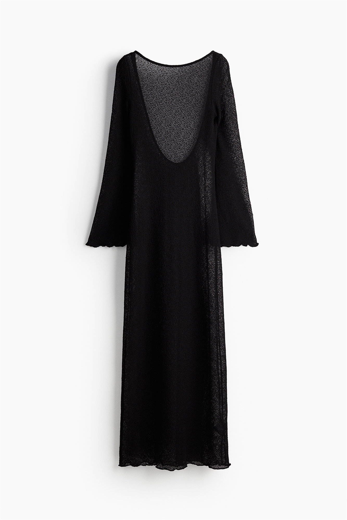 Облегающее платье длиной до колен из прозрачного трикотажа с длинными рукавами, нежным вырезом "бато" спереди и отвесным вырезом сзади. Оверлочные края на рукавах и подоле. Без подкладки.