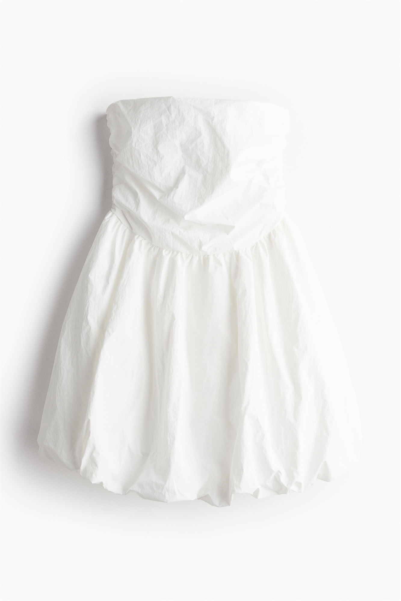 Короткое платье-бандо из тканого материала со сборками по боковым швам и платочной вставкой сзади. Собранный шов на талии и объемная юбка с пузырчатым подолом для пышного силуэта. На подкладке.