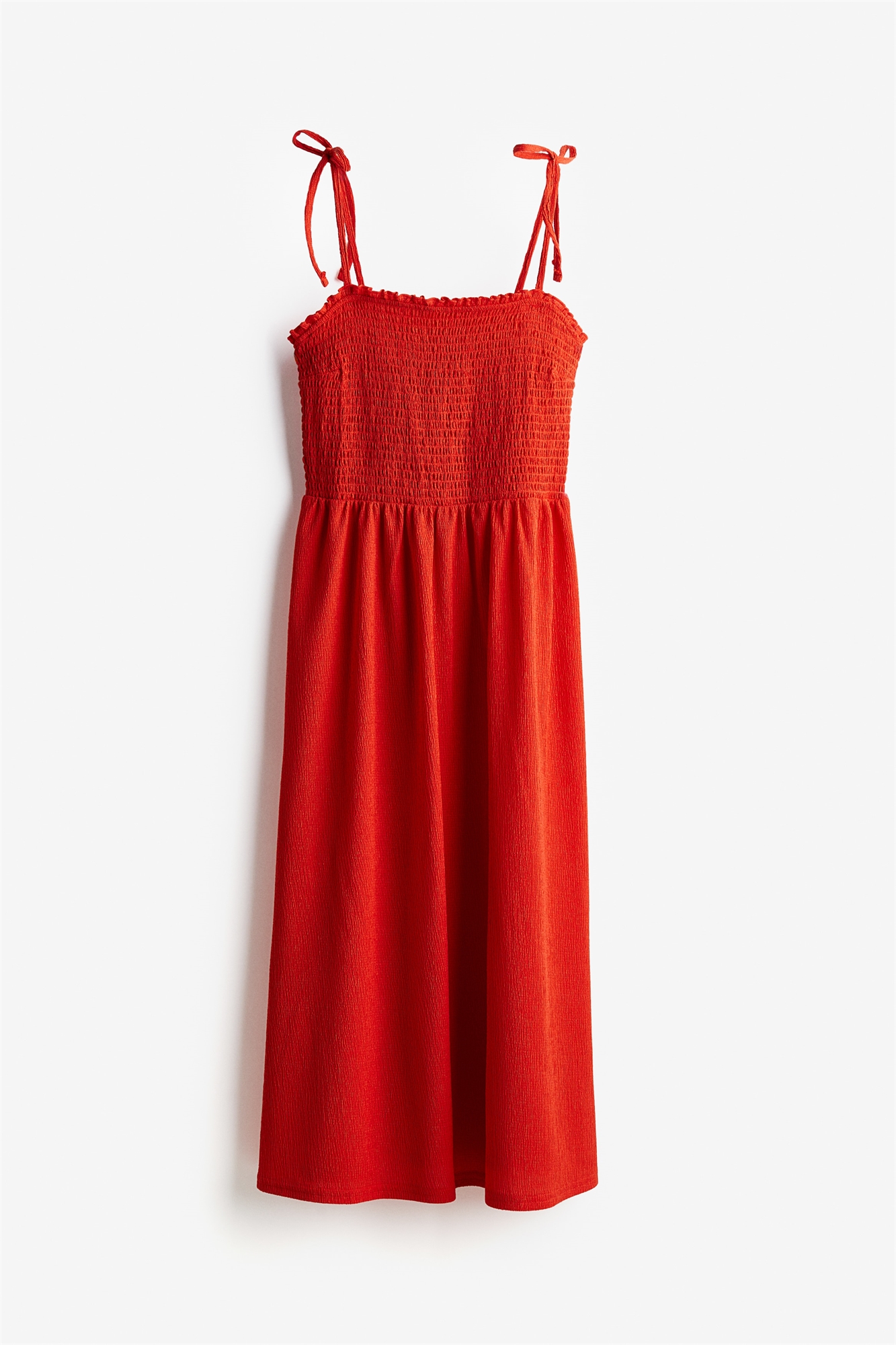 Платье из джерси длиной до колен с приталенным лифом, квадратным вырезом и узкими завязывающимися бретелями. Присборенный шов на талии и слегка расклешенная юбка.