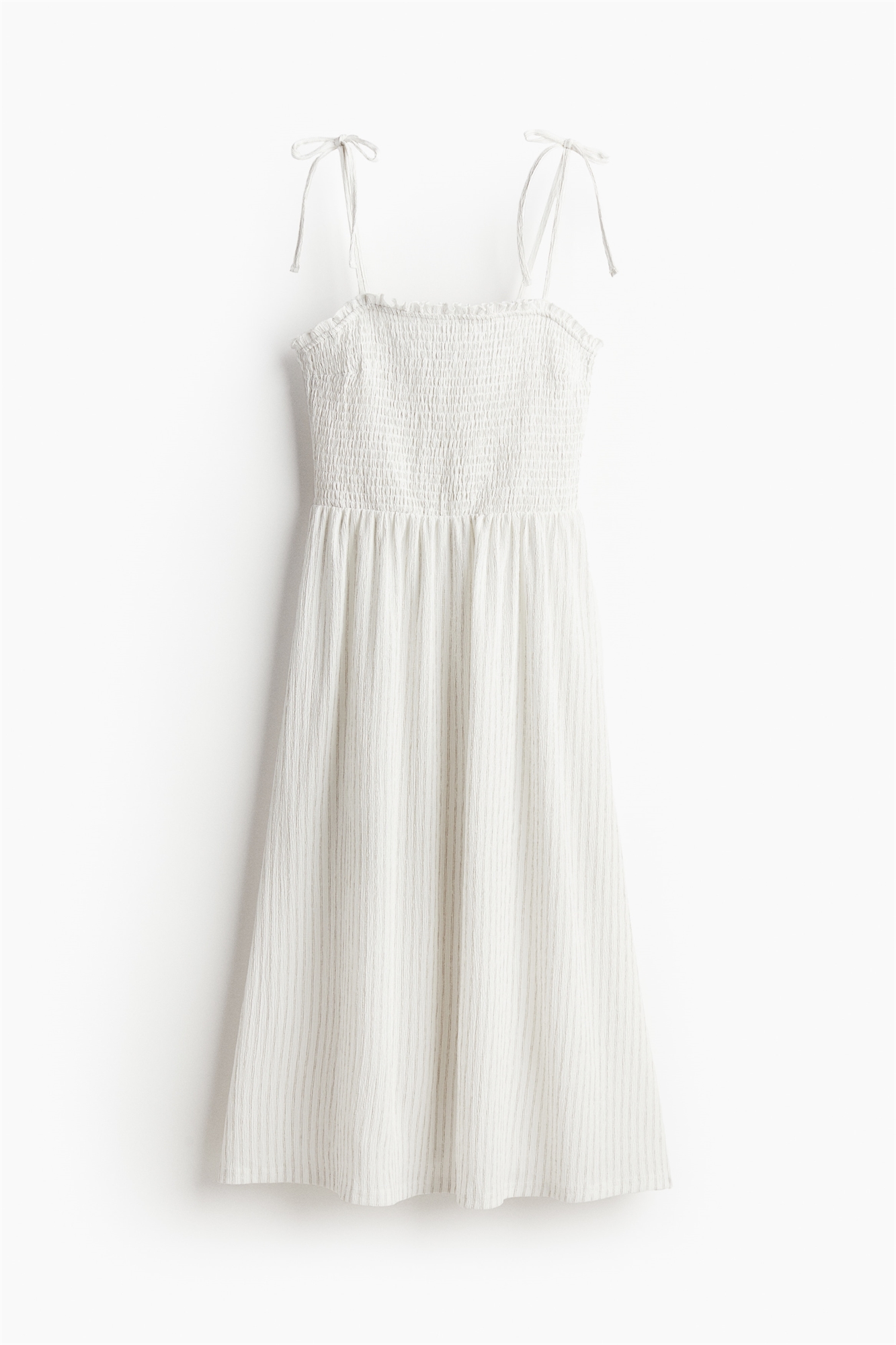 Платье из джерси длиной до колен с приталенным лифом, квадратным вырезом и узкими завязывающимися бретелями. Присборенный шов на талии и слегка расклешенная юбка.