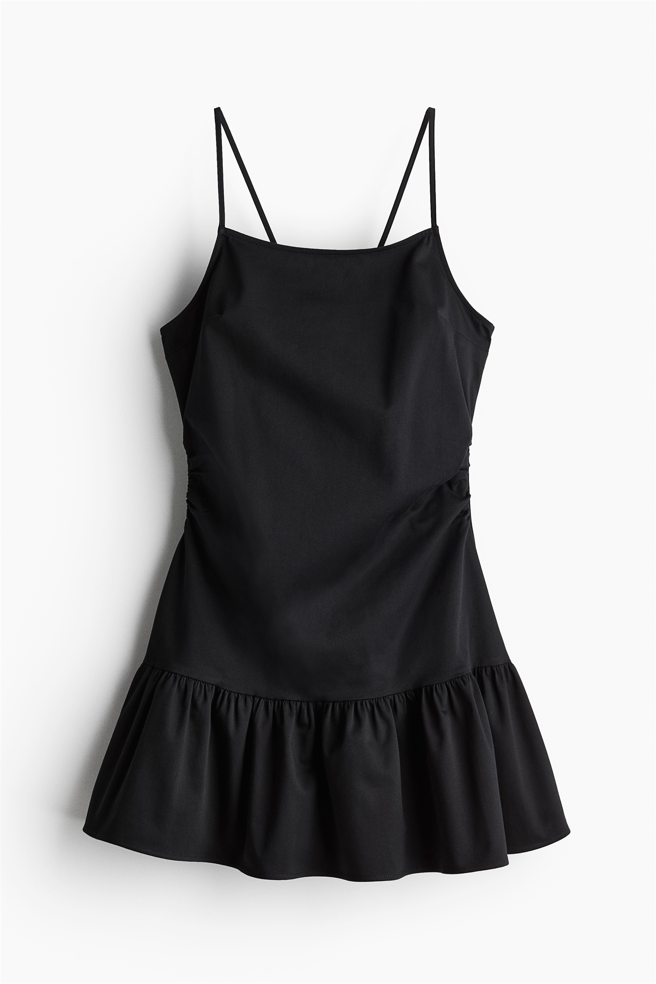 Короткое платье из мягкого хлопкового атласа с квадратным вырезом и узкими бретелями, соединяющимися сзади. Потайная застежка-молния с одной стороны и сборчатые швы с каждой стороны талии для создания эффекта легкой драпировки. Приталенный лиф и расклешенная юбка со сборчатым швом над подолом для придания дополнительной ширины. Без подкладки.