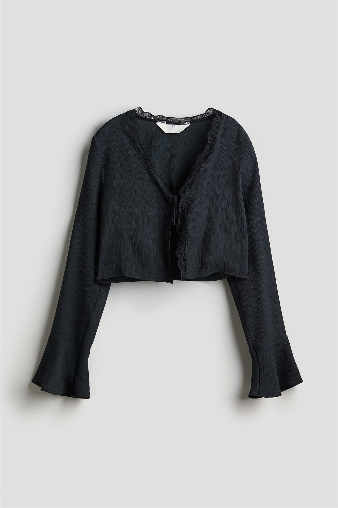 Блузка из ворсистой ткани с кружевной отделкой по краю. V-образный вырез и открытая передняя часть с незаметными завязками. Длинные рукава с расклешенными манжетами для создания силуэта "труба".
