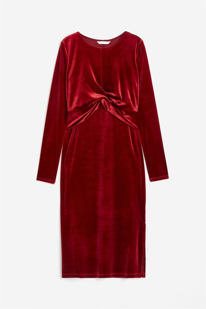 Платье длиной до колена из мягкого велюра с уникальной особенностью для кормящих. Круглый вырез, перекрученная деталь на талии, длинные рукава и подол прямого кроя с разрезом с одной стороны. Конструкция включает в себя двойной слой в верхней части, чтобы помочь сохранить тепло и облегчить доступ к груди.