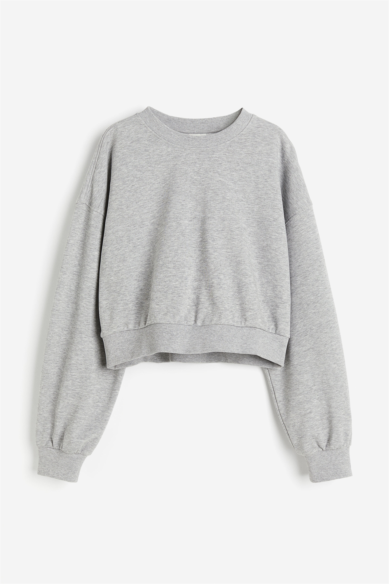 Обрезанный топ из легкого толстовочного материала. Регулярный крой с круглым вырезом, спущенными плечами и длинными объемными рукавами. Окантовка по вырезу, манжетам и подолу.