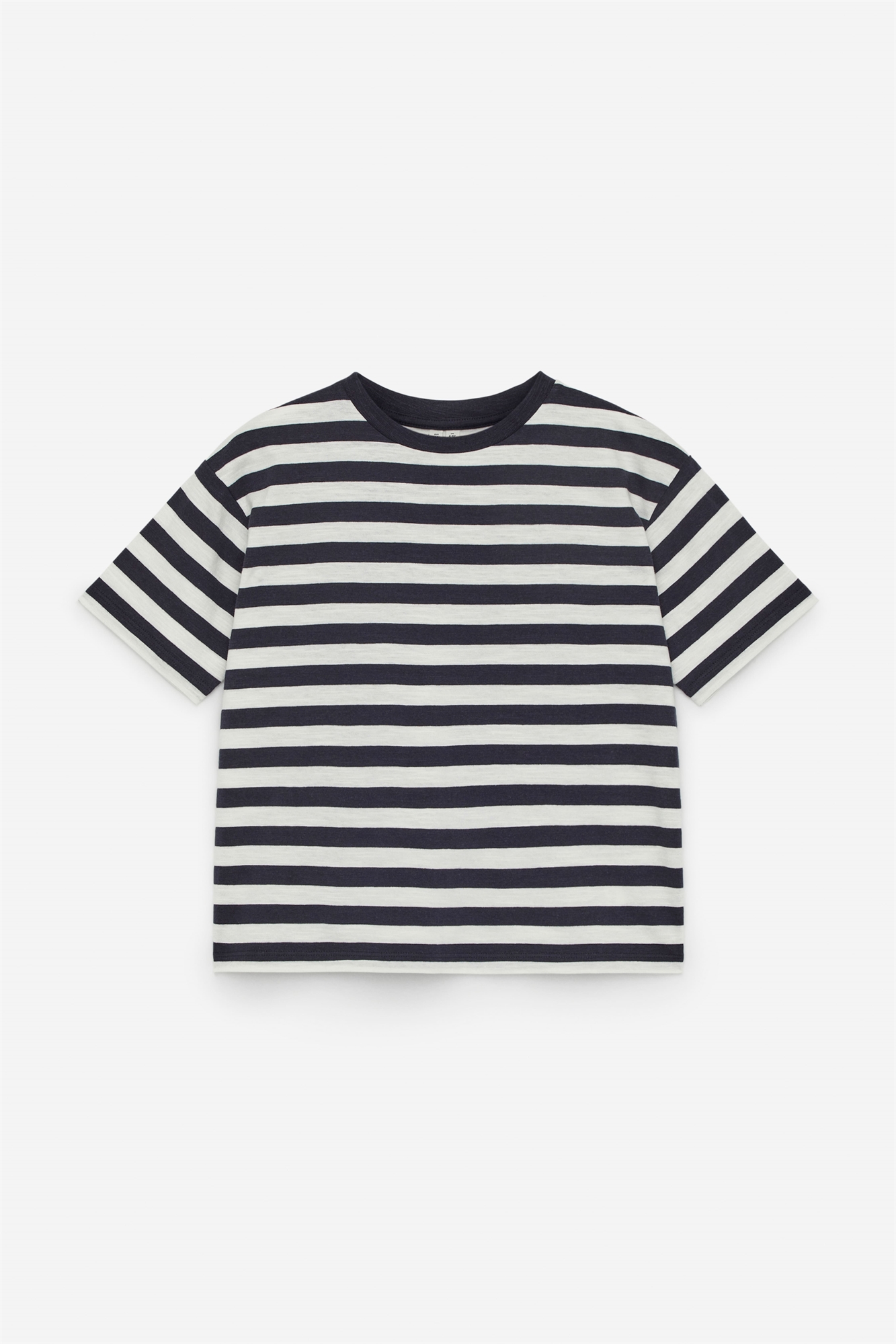 Футболка из трикотажной пряжи, придающей тактильную текстуру. Модель имеет завышенную посадку и слегка спущенные плечи.