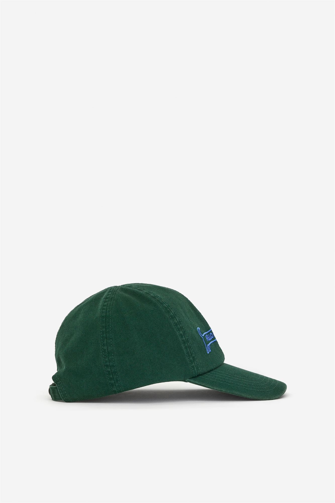 Кепка в бейсбольном стиле с вышитыми деталями. Застегивается на металлическую пряжку и регулируемый ремешок сзади.