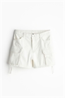 Шорты из жесткого хлопкового денима с обычной талией, ширинкой на молнии и пуговице и передними карманами. Карманы на ногах с клапаном, один из которых с небольшим накладным карманом сверху. Стяжка на подоле.