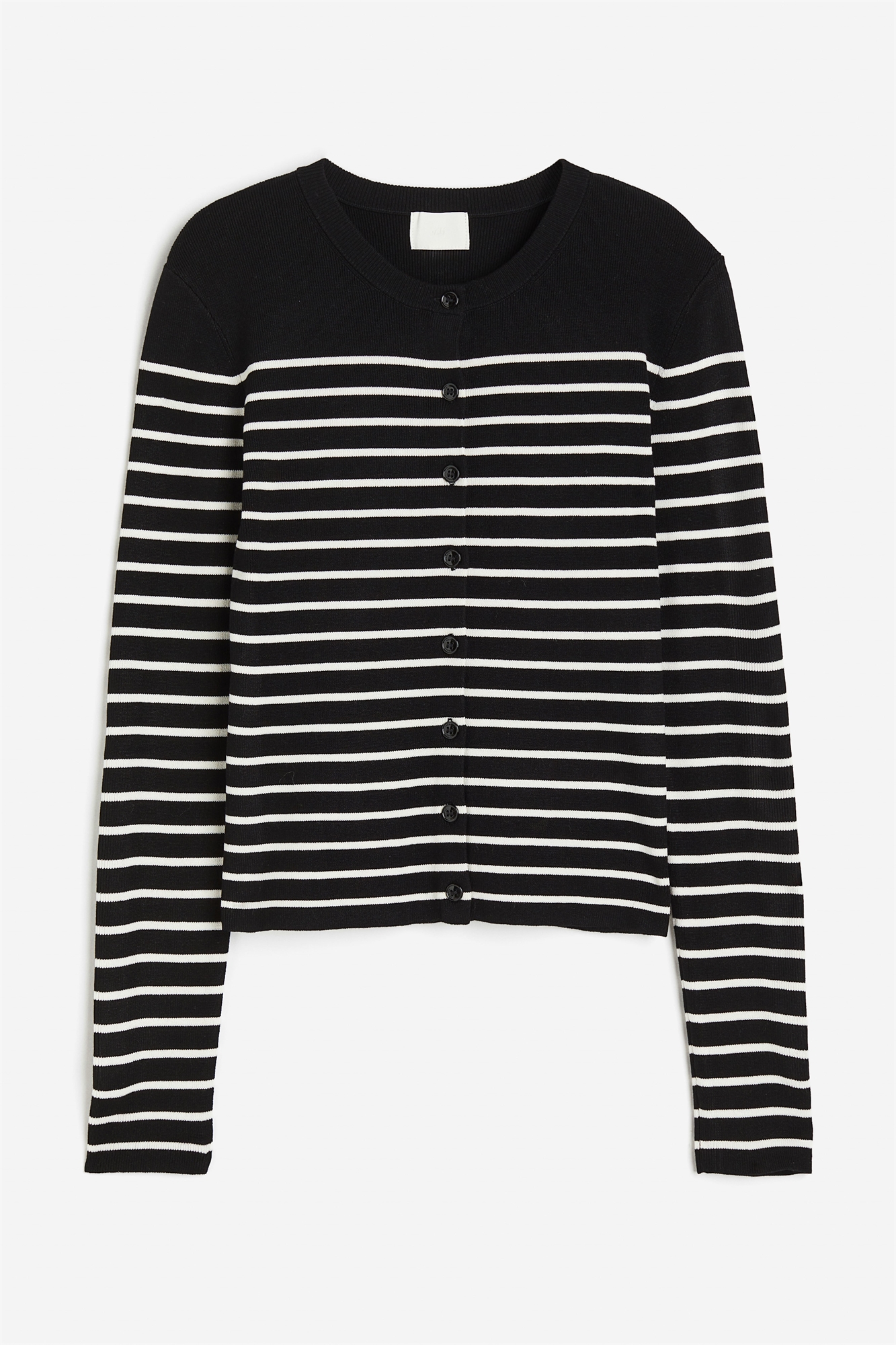 Приталенный кардиган из тонкого трикотажа с круглым вырезом, узкой тесьмой, пуговицами спереди и длинными рукавами.