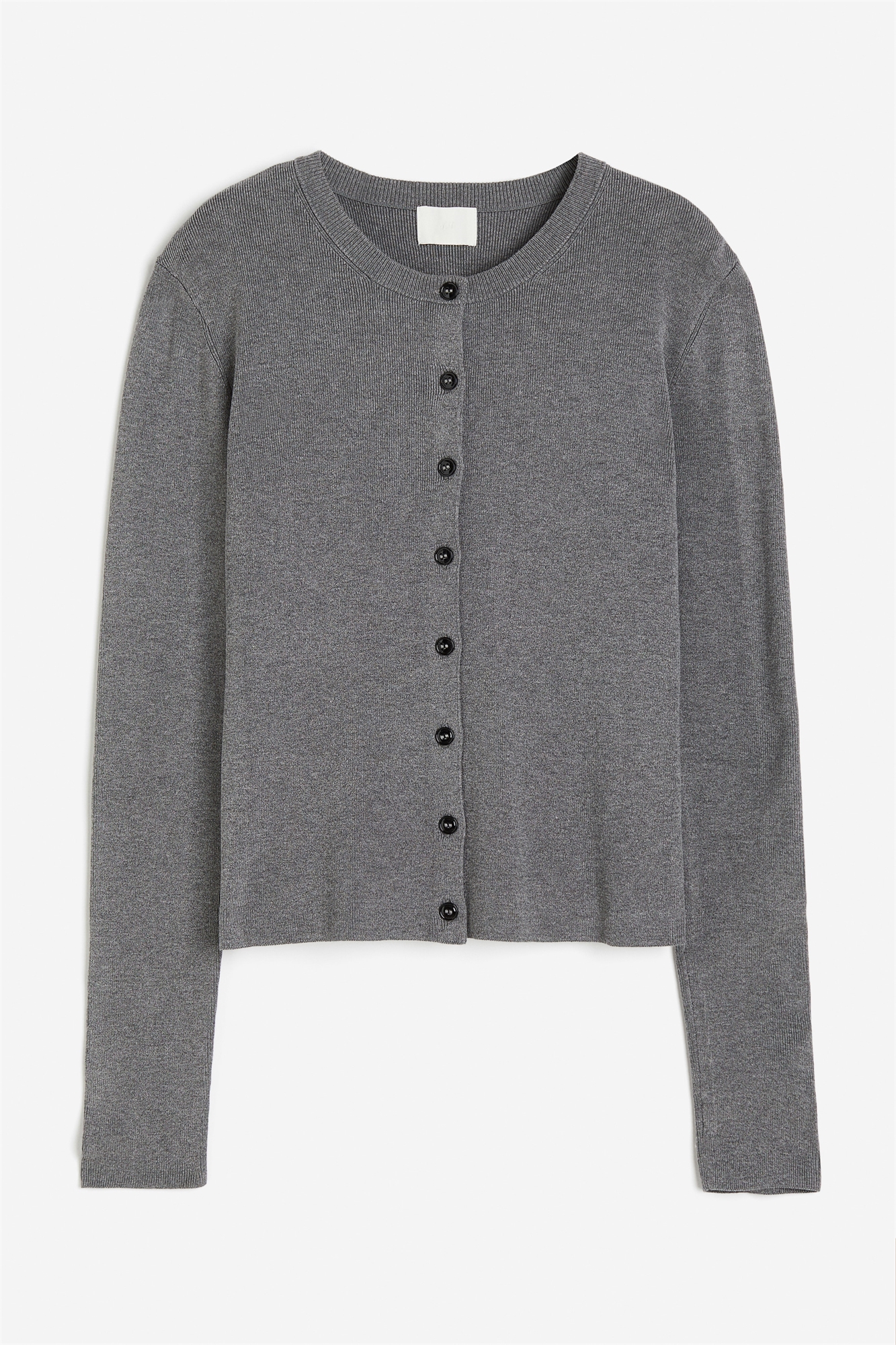 Приталенный кардиган из тонкого трикотажа с круглым вырезом, узкой тесьмой, пуговицами спереди и длинными рукавами.