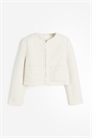Облегающий жакет из ткани букле с круглым вырезом, скрытой застежкой на крючки и глазки спереди и накладными передними карманами. Накладки на плечах и длинные рукава с разрезом на манжетах. На подкладке.