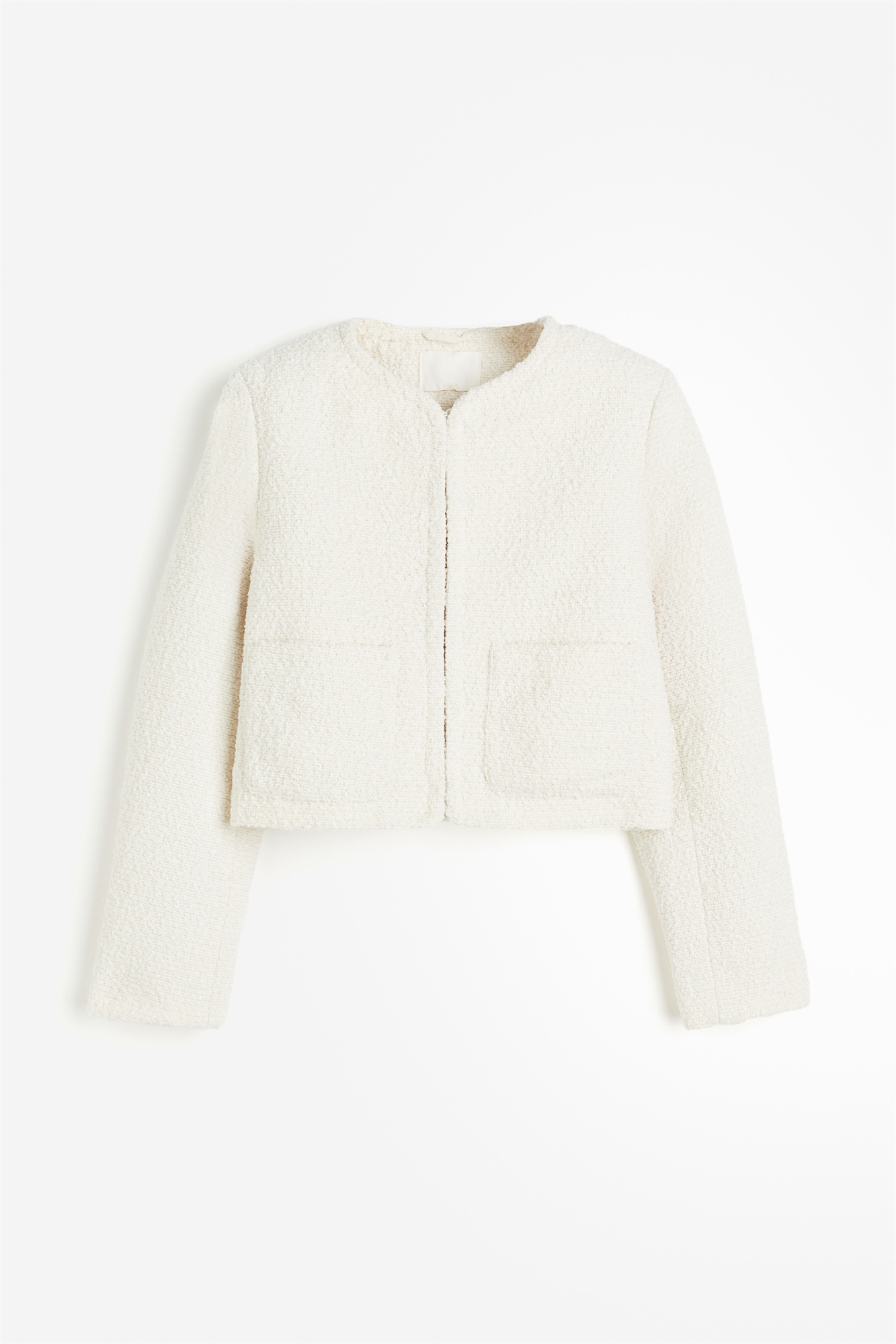 Облегающий жакет из ткани букле с круглым вырезом, скрытой застежкой на крючки и глазки спереди и накладными передними карманами. Накладки на плечах и длинные рукава с разрезом на манжетах. На подкладке.