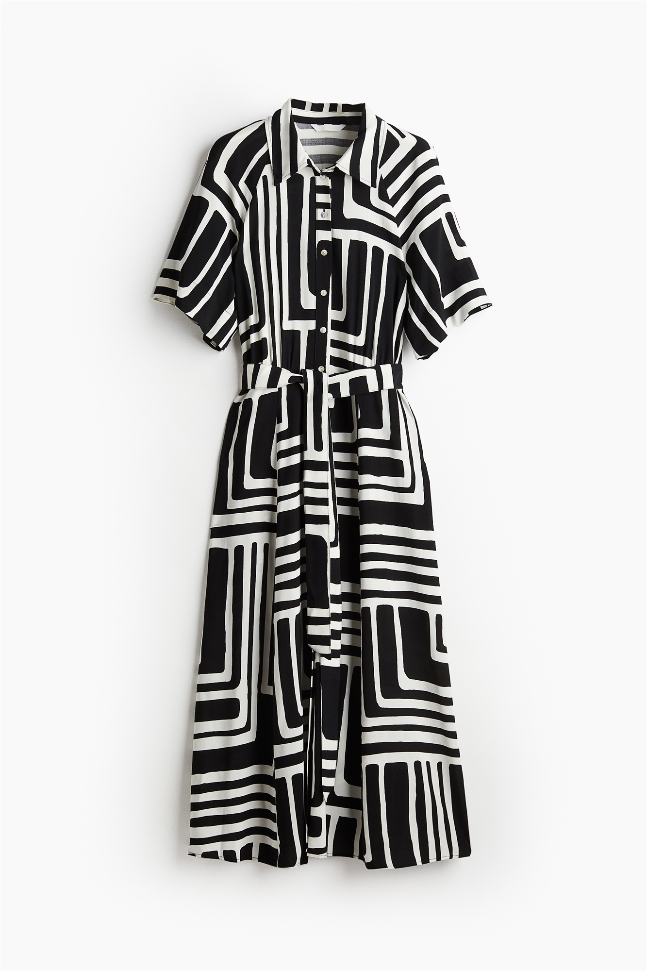 Платье-рубашка длиной до колен из тканого материала с воротником, пуговицами спереди и короткими рукавами реглан. На талии узкая эластичная резинка, сборки спереди и сзади и съемный пояс с завязками.