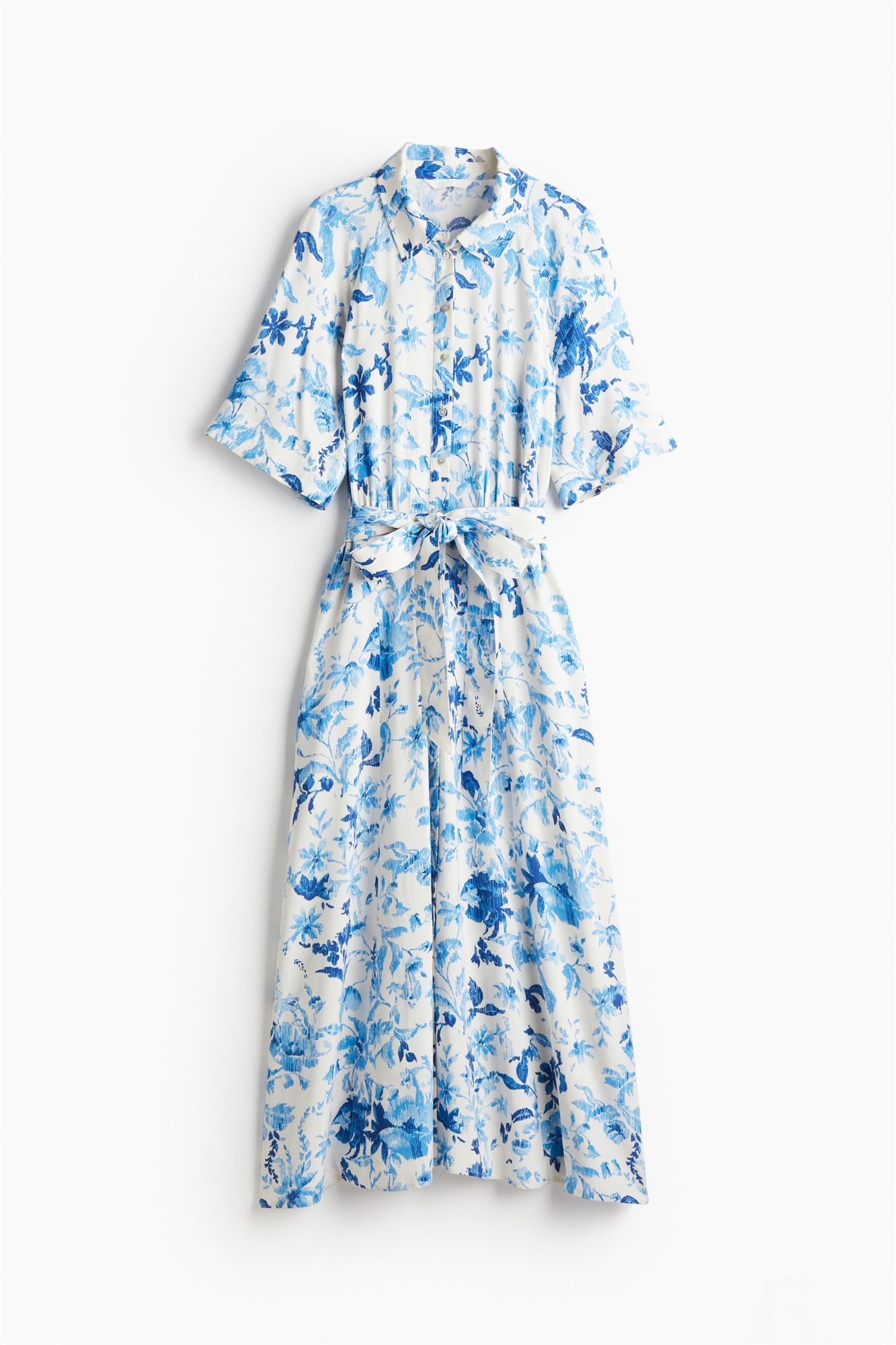 Платье-рубашка длиной до колен из тканого материала с воротником, пуговицами спереди и короткими рукавами реглан. На талии узкая эластичная резинка, сборки спереди и сзади и съемный пояс с завязками.